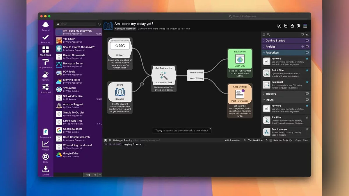 Ключовою функцією Alfred є Powerpack, який дозволяє створювати складні робочі процеси для автоматизації практично будь-яких завдань. Користувач може пов'язувати гарячі клавіші, ключові слова та дії в комплексні автоматизації, при цьому не потрібно написання коду.