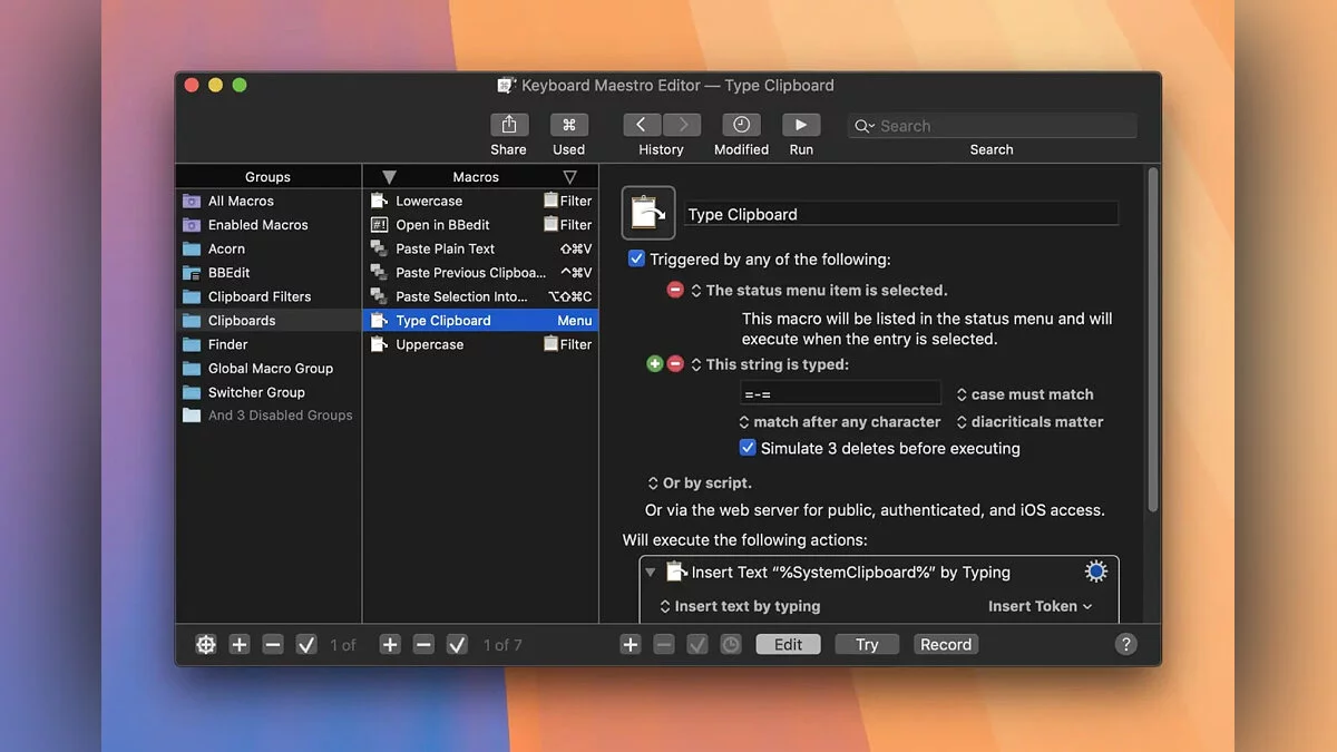 Програма підтримує широкий спектр завдань — від запуску програм і відкриття веб-сайтів до створення звітів і управління історією буфера обміну. Keyboard Maestro дозволяє об'єднувати дії в складні процеси з умовами, циклами та іншими елементами, що робить його дуже гнучким і здатним впоратися практично з будь-яким завданням.