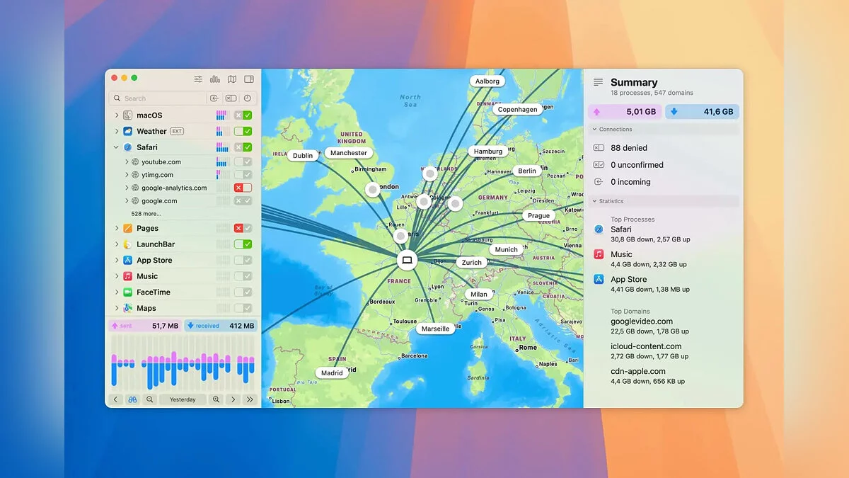 Важно розуміти, які додатки на вашому Mac підключаються до інтернету і куди відправляють ваші особисті дані. Без належного контролю можна випадково передати значно більше інформації, ніж планувалося. Для запобігання цій загрозі рекомендується використовувати додаток Little Snitch. Він відстежує, які програми підключаються до інтернету, коли це відбувається, і скільки даних передається і приймається. Ця інформація дозволяє блокувати небажані підключення і запобігти витоку даних.