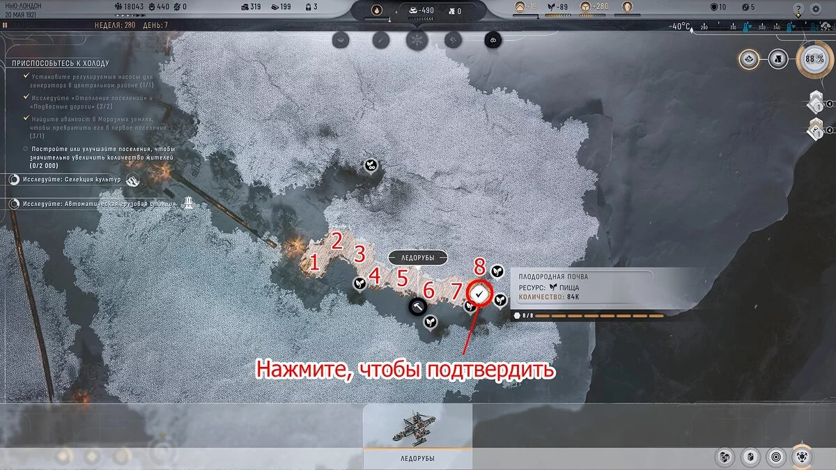 Щоб очистити ділянку, потрібно вручну проклікати гекси, які ви хочете очистити, поки не заповниться вся шкала. Один загін льодорубів може обробити до восьми гексов за раз, але для прискорення процесу можна залучити кілька загонів одночасно. В окремому гайді пояснюємо, як чистити лід і планувати райони на гексагональній карті.