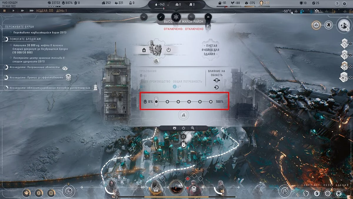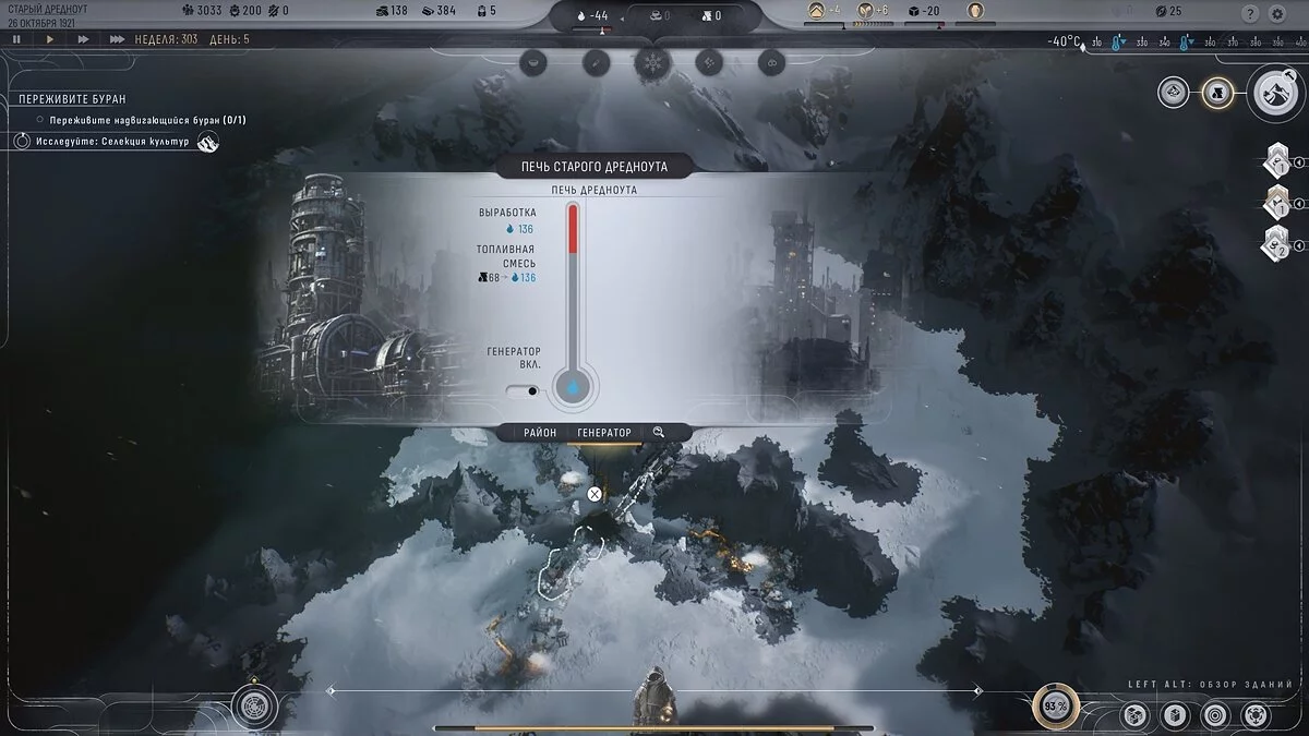 Генератор сам витрачає стільки пального, скільки доступно на складах при підтриманні комфортної температури, і для виживання в умовах екстремального холоду потрібно лише стежити за запасами пального. Але, щоб пережити бурю, знадобиться зібрати багато ресурсів — як утеплити місто і пережити першу бурю в Frostpunk 2 ми розповідали в окремому гайді.