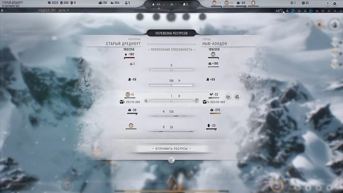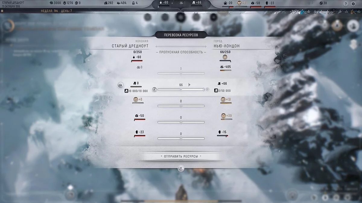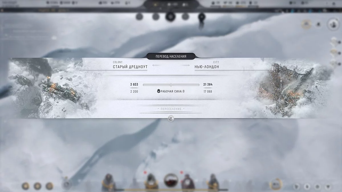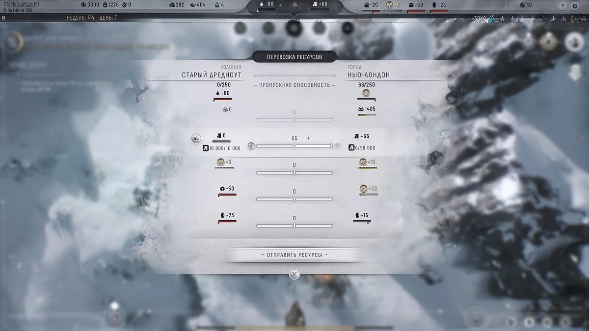 Вітаємо! Ви знайшли меню перевезення вантажів, а поруч з ним — меню пересилки людей. Вантажі між колоніями та Нью-Лондоном відправляються автоматично, вам не потрібно ще й це контролювати. А ось пересилка людей неможлива без 5 вільних морозних загонів, як і пересилка ресурсів від аванпостів і поселень.