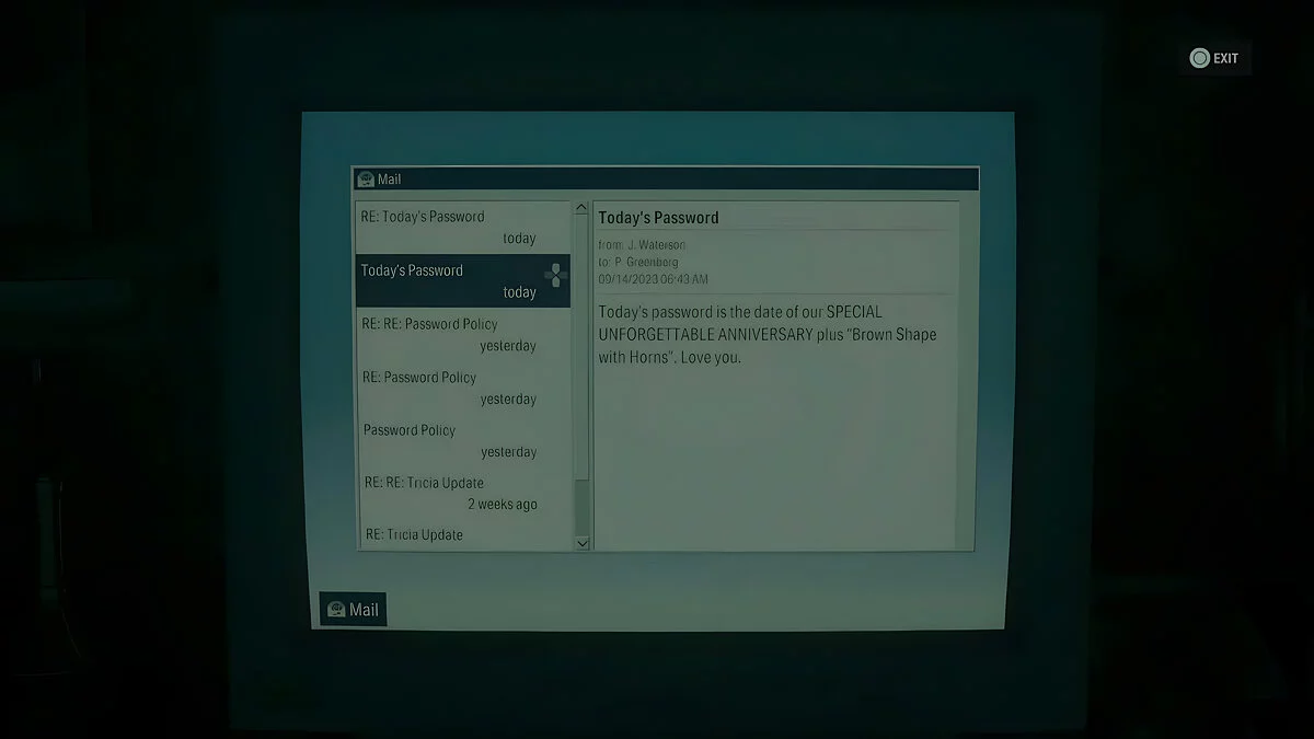 Спочатку підберіть пропуск нового рівня з бездиханного тіла, що лежить неподалік від пристрою. Так ви зможете відкрити найближчі зачинені двері. Зверніть увагу на увімкнений комп'ютер, де в одному з листів вказано, що пароль складається з дати народження та картини «Коричневі фігури з рогами».