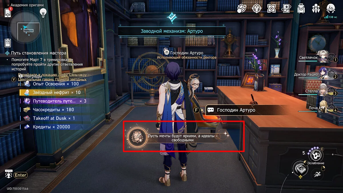 Телепортуйтесь до статуї Глаукса і увійдіть у кабінет ректора, піднявшись по сходах вгору. Поговоріть з паном Артуро і запустіть механізм. Однак він буде зламаний. Відновіть його і почніть невеликий квест: надішліть повідомлення NPC на ім'я Харрісон, Чад і Шон.