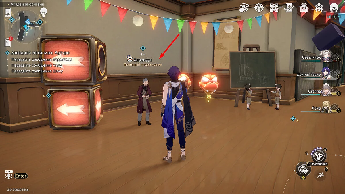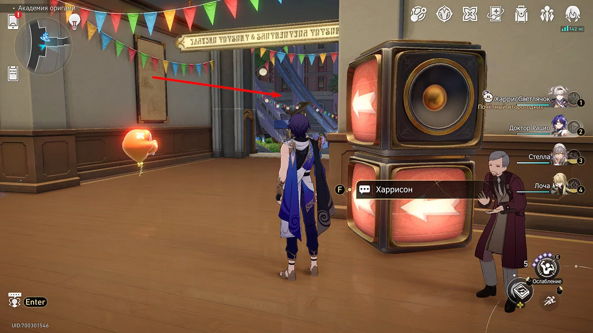 Ідіть по тому ж коридору, але вже в інший бік, до просторового якоря у Коридорі Культури. Прямо навпроти телепорта стоятиме NPC на ім'я Харрисон з гордим званням «почесний второкурсник».