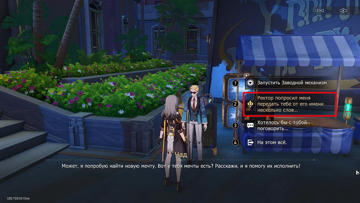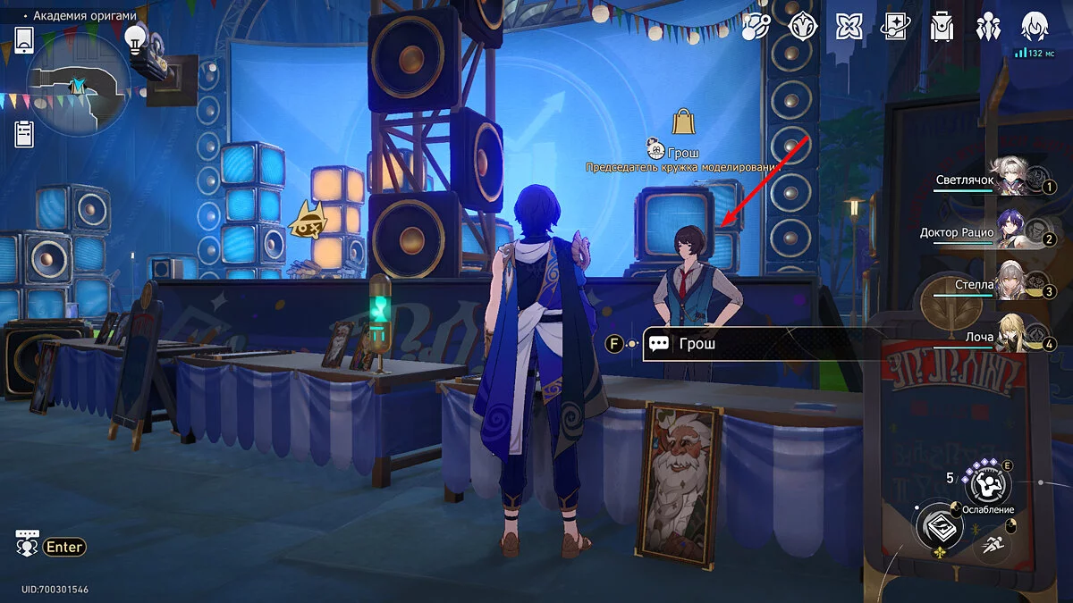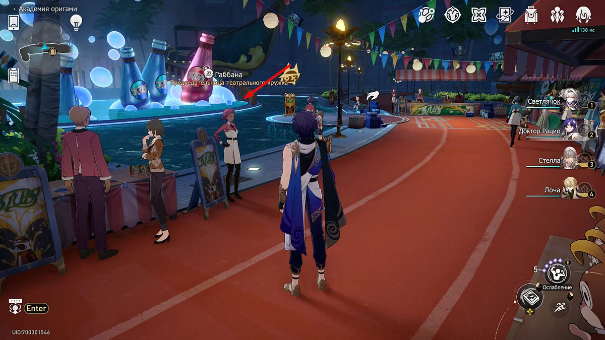 Ще одного знайомого за сюжетом 2.6 персонажа можна знайти на Творчій ярмарці. Скористайтеся просторовим якорем з такою ж назвою і пройдіть у невеликий коридор. За першою ж стійкою зліва буде стояти сором'язлива пепеши на ім'я Чалетка. Поговоріть з нею і скористайтеся заводним механізмом.