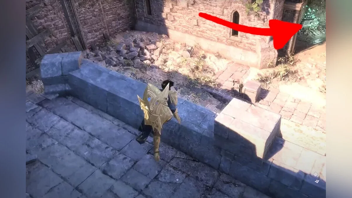 Для початку поверніться туди, де ви знайшли першого скелета. З цієї кімнати стежка веде на галявину з двома гігантськими статуями. Як тільки ви вийдете з замку, ви побачите маркер цілі праворуч, де в будівлі є дірка. Вам потрібно вибухнути бочку, щоб відкрити новий шлях.