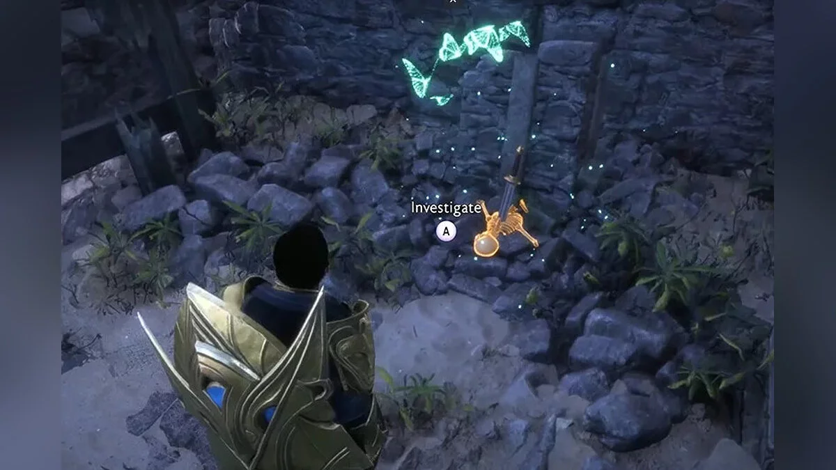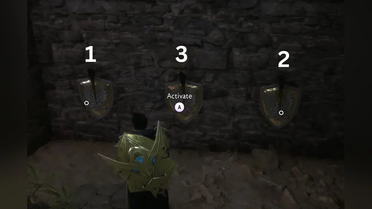 Для початку візьміть першу кімнату як відправну точку і стрибайте в велику кімнату зі статуєю в кінці. Ідіть до статуї, а потім у кімнату праворуч. В кінці шляху знаходиться скелет з застряглим у ньому мечем. Взаємодійте зі скелетом.