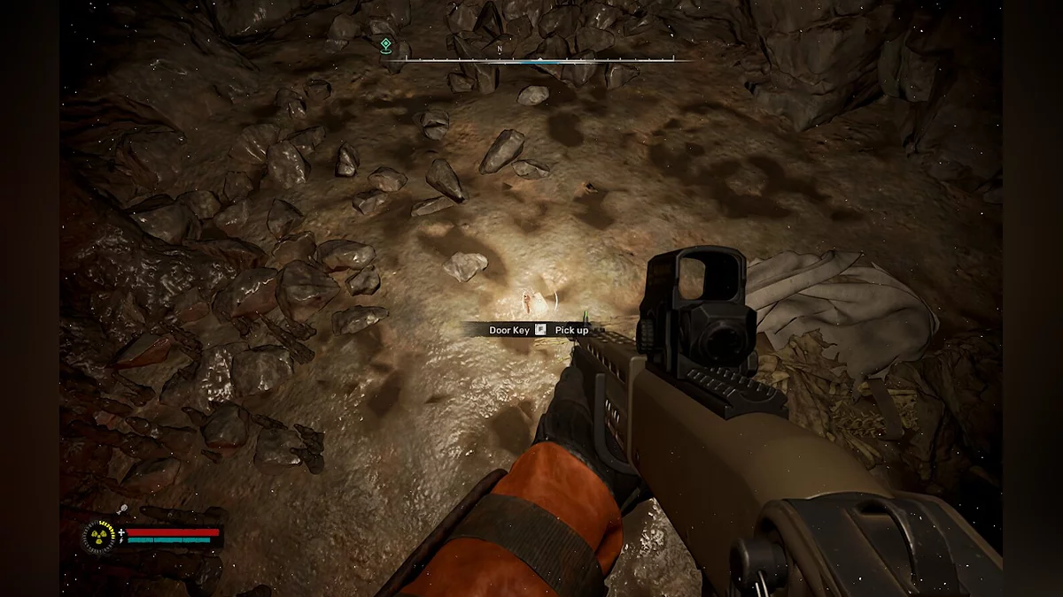 - Пройшовши трохи від дверного отвору, ви помітите скелет, поруч з яким лежить ключ від дверей. Підберіть його.