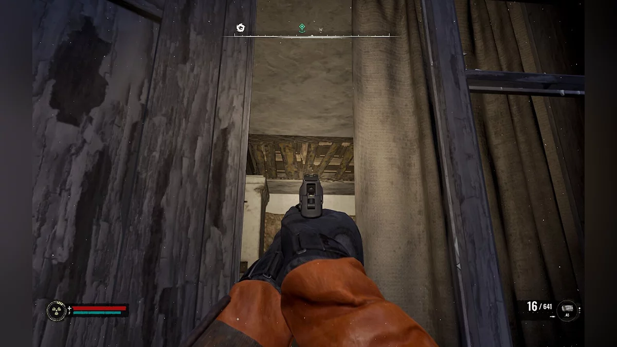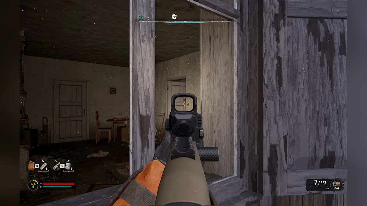 - Обійдіть будинок з правого боку, де біля входу ви побачите два вікна. Зверніть увагу на ліве вікно — на стелі будуть видні дерев'яні дошки, які потрібно зруйнувати пострілами. Рекомендуємо вистрілити в кожну дерев'яшку, щоб коробки над ними впали на підлогу.