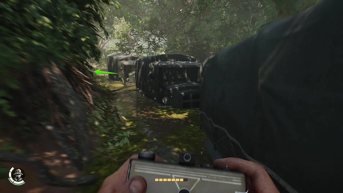 У будь-якому випадку вам потрібно пробратися на другий поверх двоповерхової будівлі. До слова, на парковці автомобілів прямо перед ним лежить уніформа Королівської армії і ключ, що відкриває решітку на другому поверсі поруч із сейфом. Якщо вдасться непомітно забрати речі — зекономите багато часу.