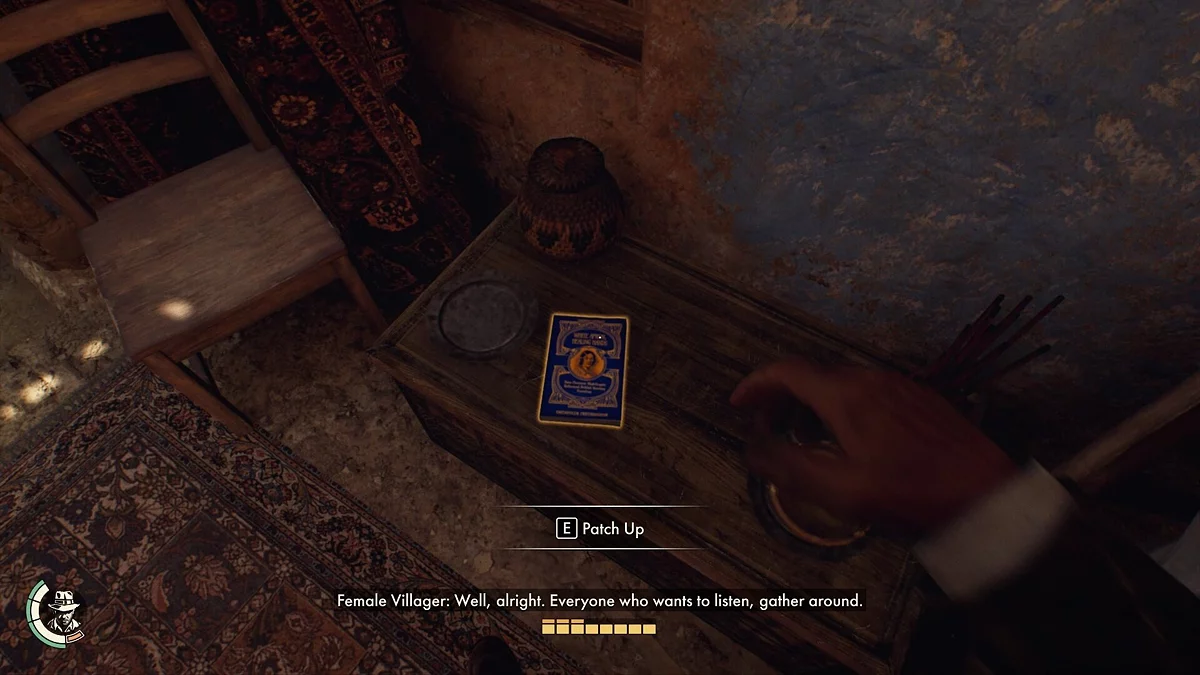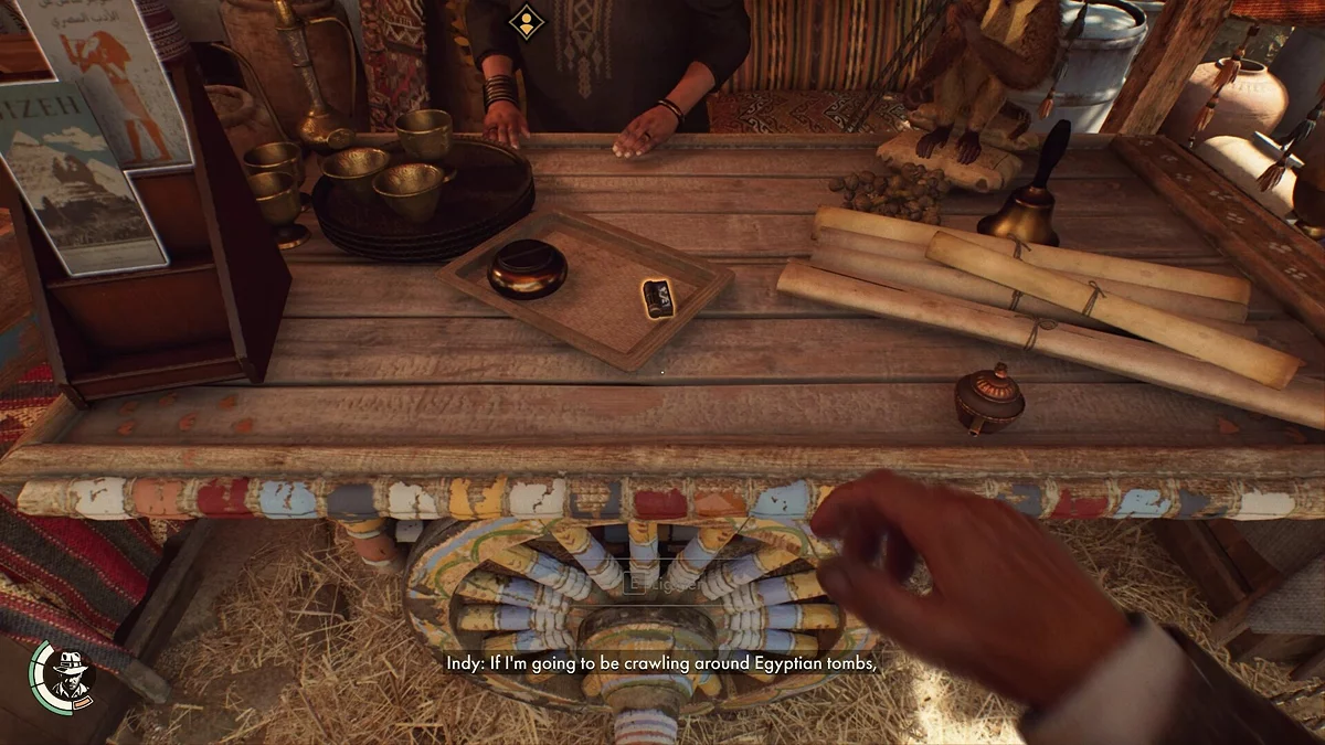 На карті з'явиться черговий маркер. Слідуйте за ним і паралельно огляньте поселення. Тут можна зробити досить багато фотографій, за які Індіана отримує очки пригод. Окрім цього, в одному з будинків можна знайти книгу навичок Patch Up. Коли будете готові, поспілкуйтеся з торговцем і купіть звичайну запальничку всього за 75 лір. Зліва від палатки цієї торговки на лавці буде лежати ігрова карта Повішеного чоловіка.