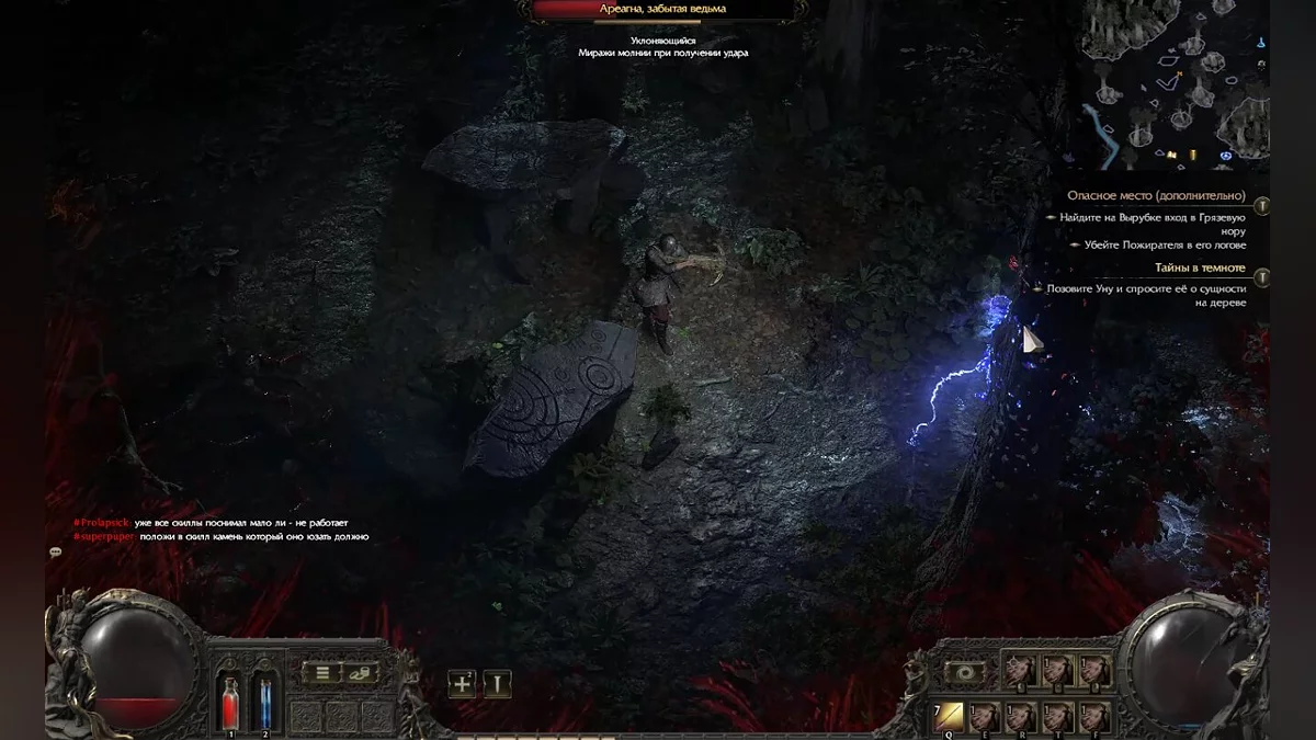 Відьма буде постійно викликати фантомів, які будуть прагнути підійти до героя і вибухнути, перетворюючись на блискавки. Крім того, вона буде телепортуватися в випадкові місця, а іноді — прямо перед вами, завдаючи швидкий шкоди. Ми не рекомендуємо завдавати їй більше двох ударів або пострілів за раз, оскільки таймінг телепортації швидший, ніж ваші атаки. Перемігши відьму, ви отримаєте кілька непотрібних предметів, золото і, найголовніше, необроблений камінь навички.