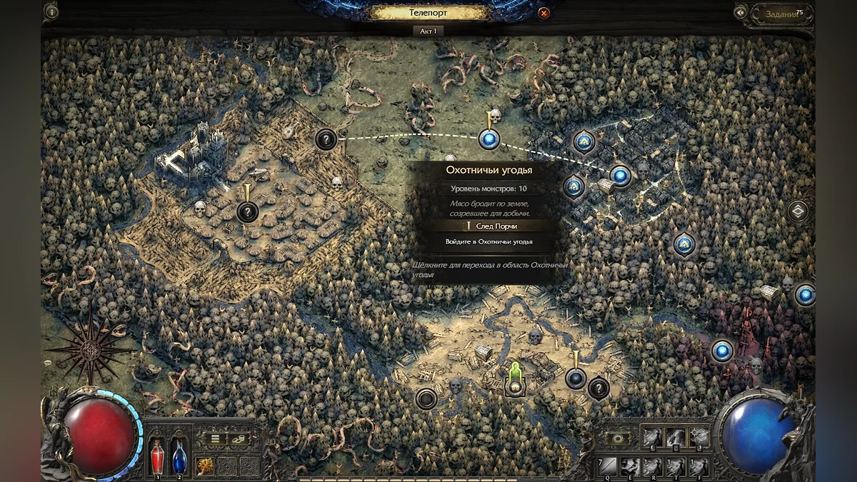 Охотничі угіддя будуть доступні для телепортації з табору. Підійдіть до порталу і виберіть цей регіон, розташований ліворуч від кладовища. Будьте обережні: якщо ваше прокачування не відповідає рівню регіону, радимо спочатку виконати кілька побічних квестів і прокачатися.