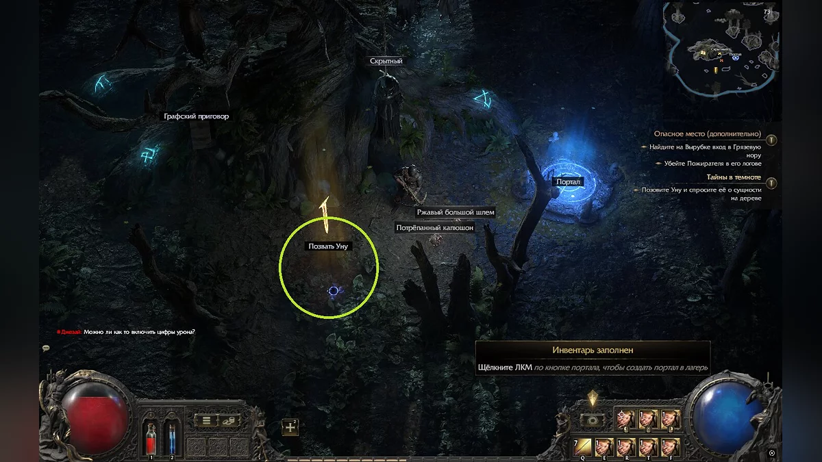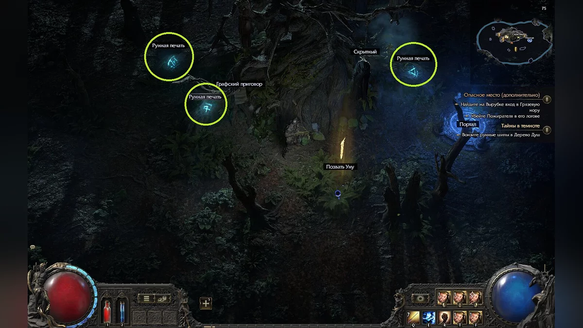 Тепер вам доведеться дослідити південно-східну частину Грельвуда, де ви зможете знайти Схованого — NPC, що фігурує в останньому завданні першого акту і графському вироку. Підійдіть до чорного кола і взаємодійте з ним, щоб покликати дівчину на ім’я Уна. Поговоріть з нею, щоб продовжити.