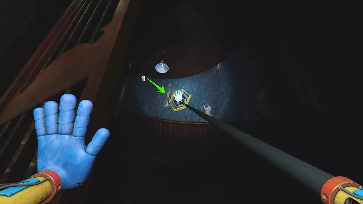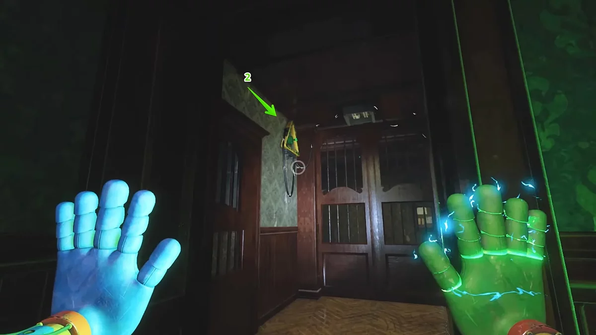 За допомогою фіолетової рукавички підніміться вище, пересуньте шафку між кімнатами і пройдіть через сусідній номер. У кімнаті з зображенням сонця є два слоти для батарей, а також одна батарея. Від цього приміщення йдіть наліво до кінця і подивіться вгору. Вчепіться рукою, щоб опинитися на верхньому поверсі. Біля великої іграшки буде лежати друга батарея.