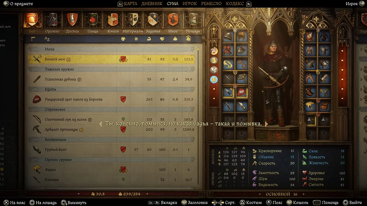 У меню гравця вас навчать системі костюмів. Це три пресети, між якими можна швидко перемикатися. Ви повинні зібрати комплект для бою з максимальною захистом, комплект для спілкування з максимальним шармом, а також костюм для стелсу, в якому ви не будете шуміти. Зверніть увагу, що кров і бруд впливають на успіх ваших діалогів. Регулярно умивайтеся в бадьях і приймайте бані, щоб змити все зайве. Одяг можна ремонтувати, прати в ставках і банях. Це також важливо робити час від часу. Місця для безкоштовного прання позначені на карті.