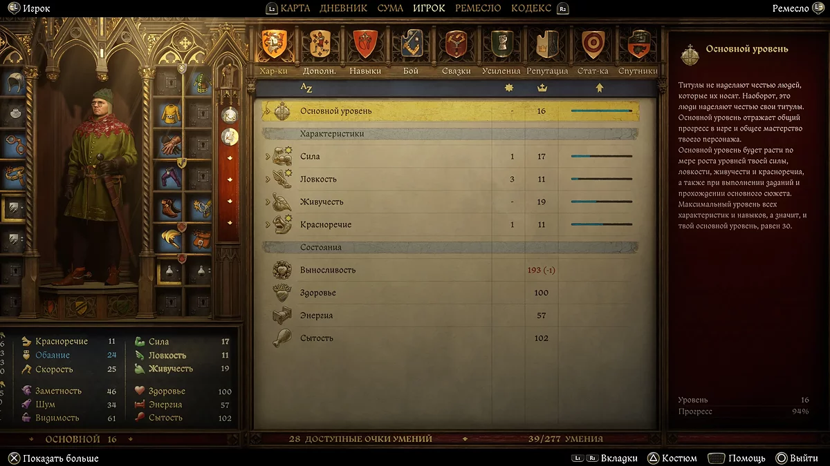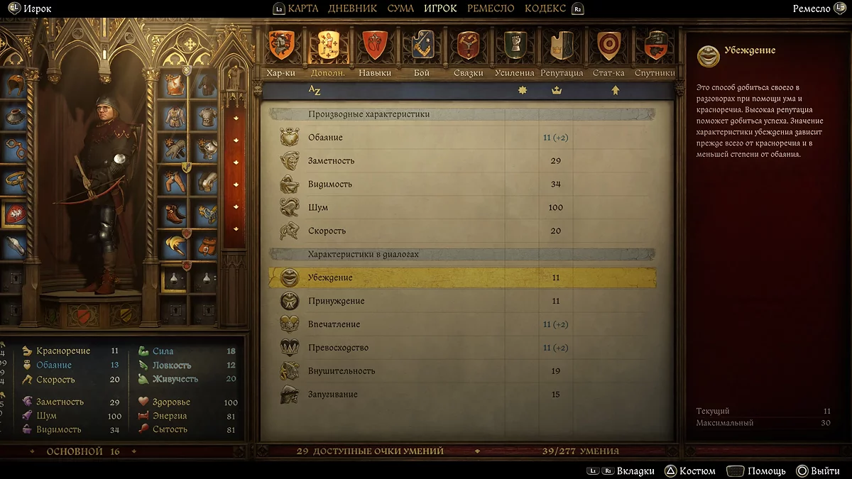 - Враження — ще один компромісний варіант, на який впливають якість і краса як самого Генрі, так і одягу. Тут грає роль цінність вашого одягу, наскільки ви чистий і добре пахнучий. Чим вища характеристика «Обаяние» в меню інвентаря, тим більше шансів на успішний результат.