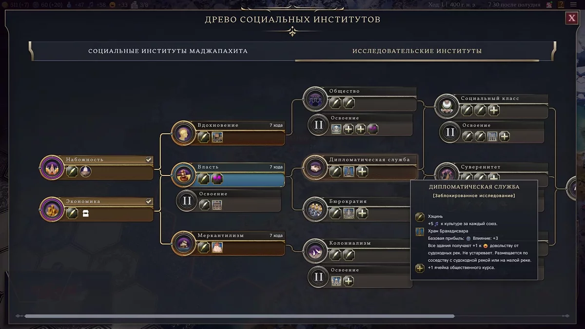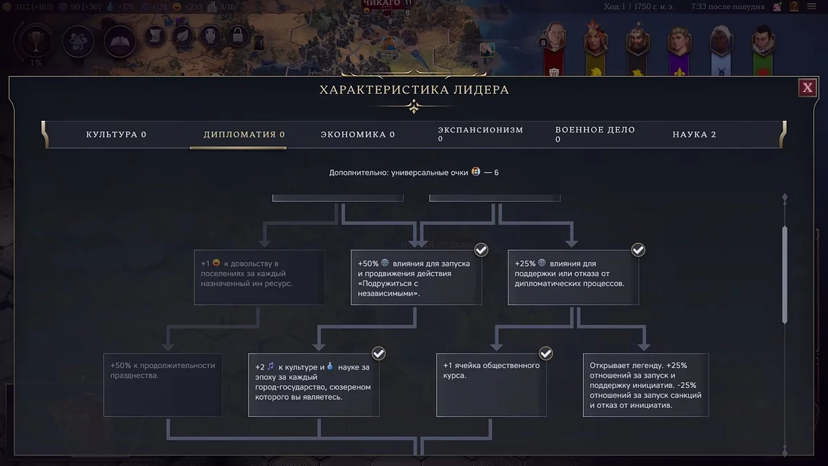 Третім способом стане прокачка вашого лідера в гілці «Дипломатія». Практично всі здібності в цій категорії суттєво посилюють політичний потенціал держави.