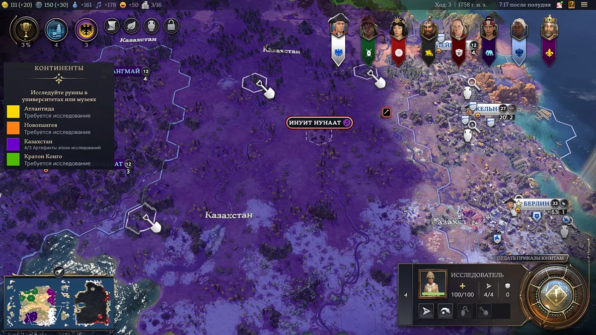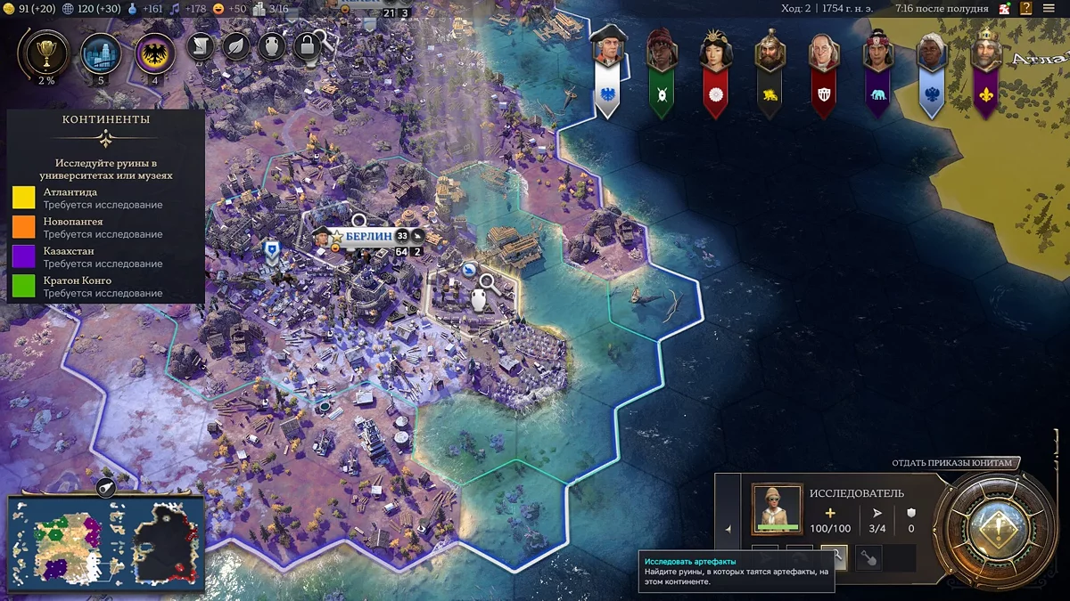 Без відкриття певного регіону ми не зможемо збирати артефакти. Досліджувати умовний Казахстан або Атлантиду можна в найближчому музеї чи університеті: потрібні місця позначені лупою та античним посудом. Варто врахувати, що дослідники можуть вільно переміщатися по території іншого правителя та користуватися його будівлями.