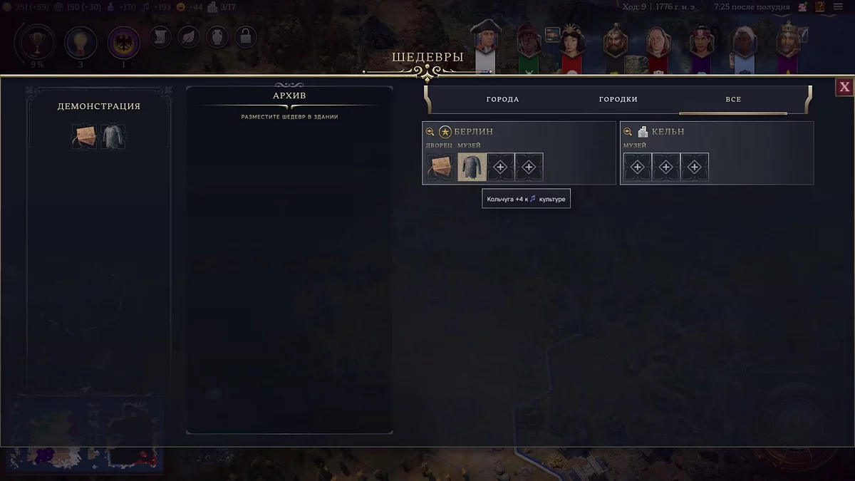 Після активації збору дослідник через деякий час викопає щось раритетне: папірець, сокиру або кольчугу минулих епох. Але на цьому робота не закінчується. Далі нам потрібно розмістити артефакт в одному з будівель. Понадобиться музей або палац. Чим більше у нас музеїв, тим більше реліквій ми можемо виставити на показ. Використовувані артефакти також дають бонус до культури країни.