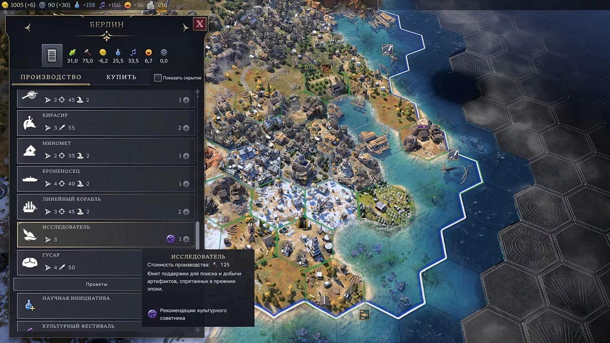 Для початку нам необхідно дослідити одну з культурних гілок нашої держави — «Природознавство». Після її відкриття ми зможемо створювати спеціальних юнітів — дослідників.