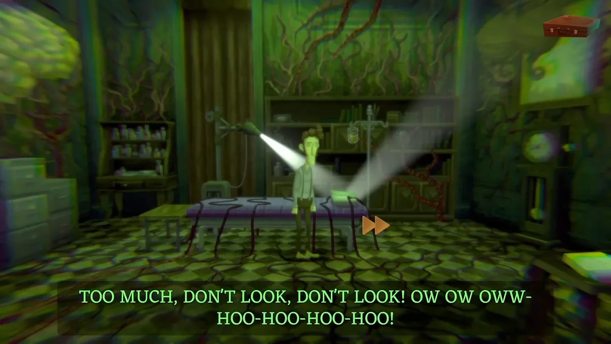 Слід зупинитися перед дверима в офіс доктора і застосувати гриби на головному героєві. Попередньо він постукає в двері, потім з'їсть гриб і впаде в непритомність. Коли персонаж прийде до тями, подивіться коротку сцену, після якої управління повернеться до гравця. Заберіть на столі музичну шкатулку, документ і лоток. Увімкніть лампу, потім поставте лоток на кушетку.