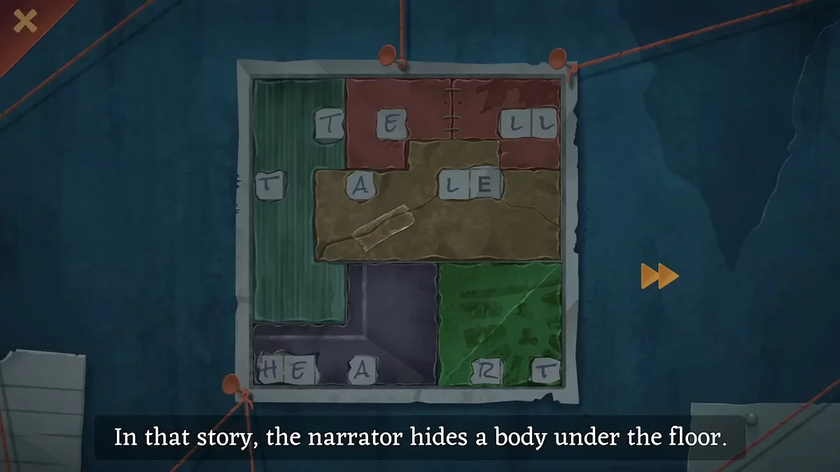 Однак прослідувати в ліс у повній темряві ви не зможете. Поверніться назад і слідуйте по правій стороні дороги. Біля одних з дверей ви почуєте радіо, а головний герой вирішить зайти всередину. Ви опинитеся в дивній порожній кімнаті: візьміть з підлоги ножиці і вивчіть нотатки на стіні. Прийдеться правильно розставити вирізки, щоб вирішити пазл. Орієнтуйтеся за скріншотом нижче, має вийти наступний напис: Tell Tale Heart.