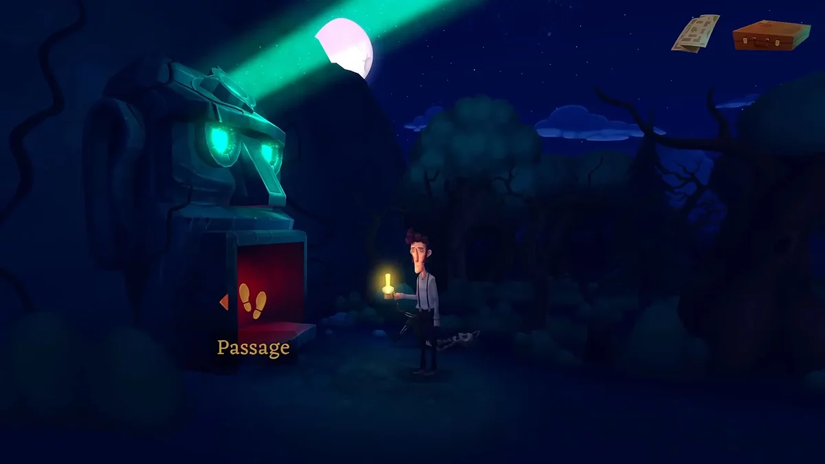 Перемістіться до будівлі маяка. Спустіться вниз до механізму і встановіть значення 320 градусів. Ліхтар маяка буде світити прямо на палицю, а та підсвітить тотем у лісі. Взаємодійте з ідолом, щоб відкрити секретний прохід.