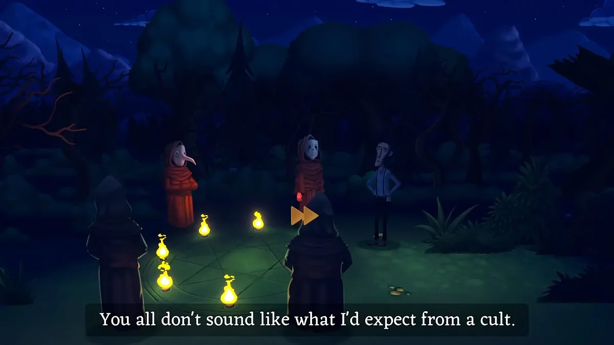 Поверніться на розвилку в лісі і бігайте наліво. Якщо спробуєте пройти через квіти без протигаза, побачите кумедну сцену. Застосуйте маску на квітах, щоб герой надів її і безпечно пройшов вперед. Врешті-решт ви опинитеся поруч з культистами. Задайте їм всі питання, які вас цікавлять, і покажіть золотий ідол.