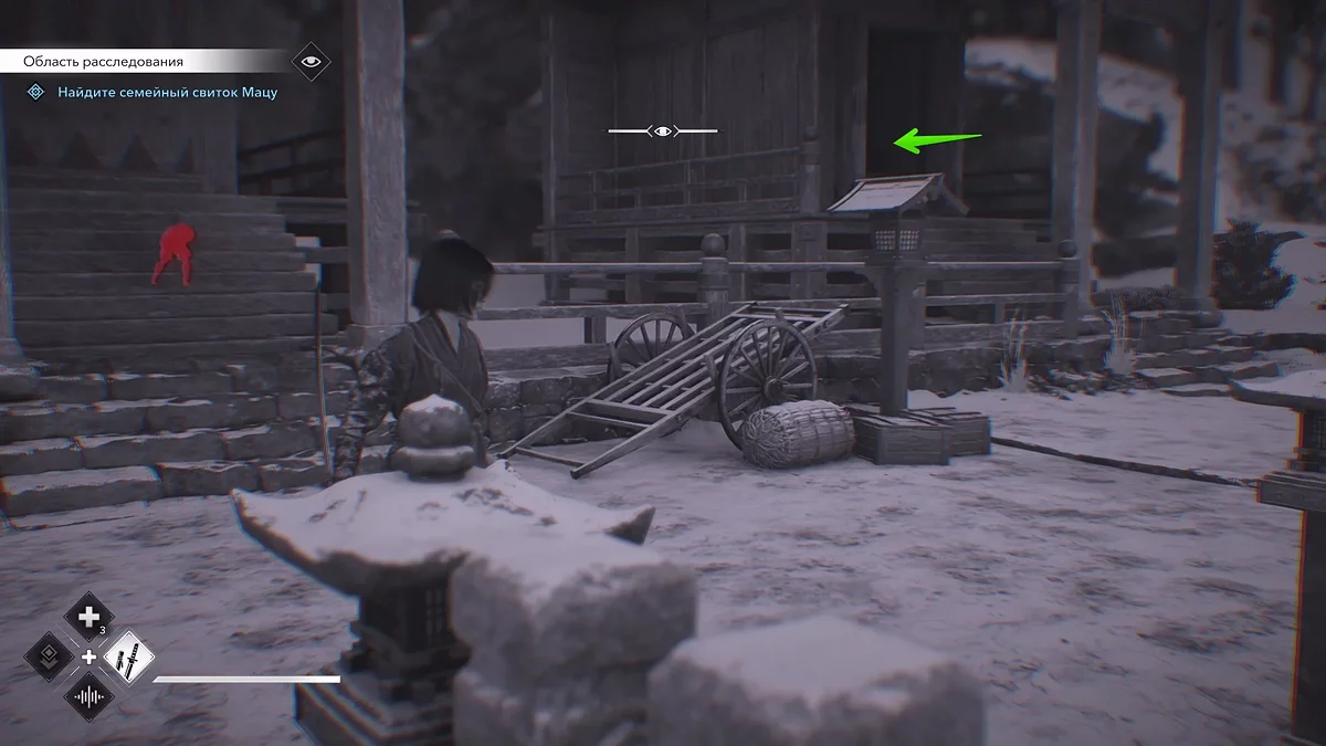 Жінка знаходиться поруч зі своєю хатиною. Слідуйте через невеликі поля на захід і поговоріть з нею. Мацу попросить принести сімейний сувій, схований у храмі неподалік.