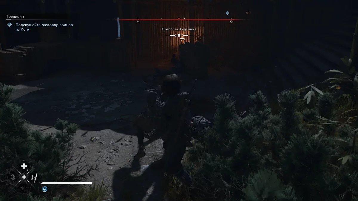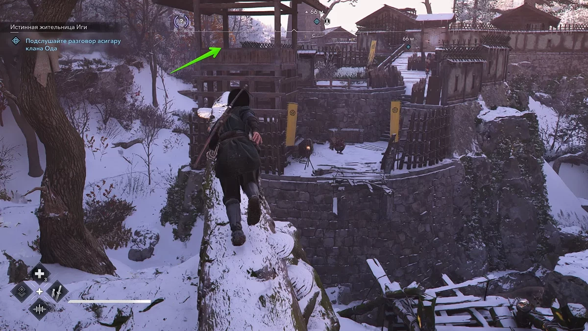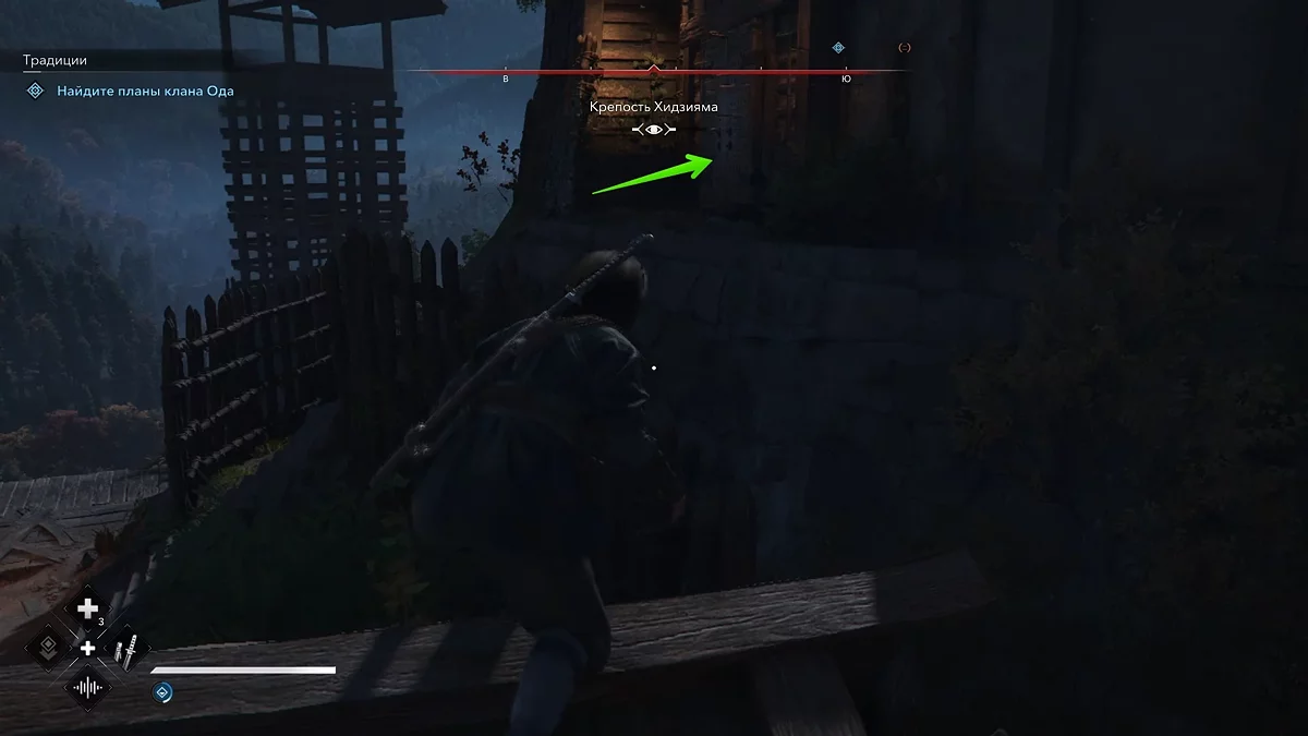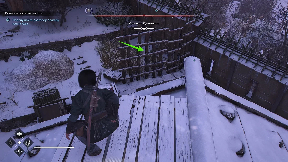 Поговоріть зі старійшиною села, щоб отримати нове доручення. Слідуйте єдиною дорогою за маркером, поки не опинитеся у задній частині фортеці. Обійдіть її з правого або з лівого боку, щоб виявити повалене дерево. Забирайтеся на нього і використовуйте гак — так ви опинитеся на вартовій вежі.