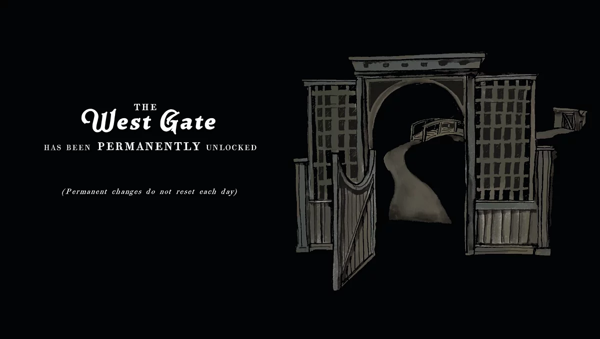 - Західні ворота — відкриває доступ до зовнішніх кімнат. Для відкриття хвіртки рухайтеся по лівій стороні маєтку і відкрийте кімнату Гараж. Потім активуйте електрику і відкрийте ворота. Вибравшись на вулицю, доберіться до хвіртки з іншого боку і відсуньте засув.