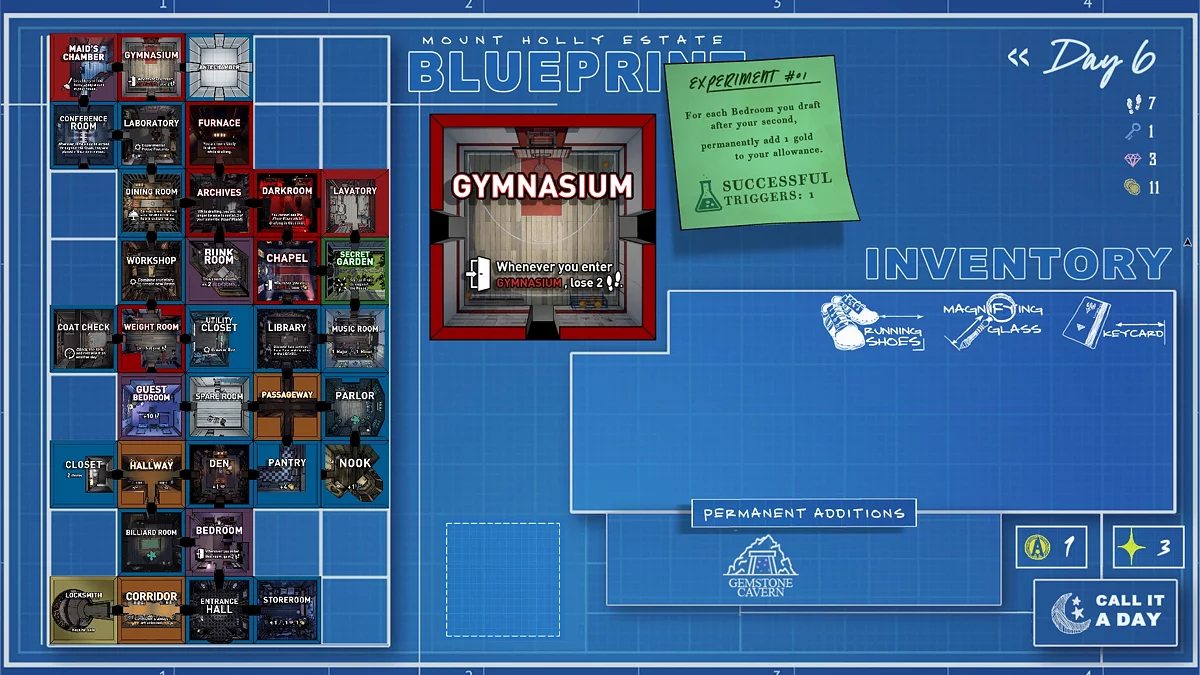 На вході у вас буде завжди три двері. Відкривши їх, на вибір отримаєте кілька кімнат, які можна «створити» в маєтку на один день, щоб просуватися далі. Якщо спростити, гравцям потрібно розставити кімнати таким чином, щоб вибудувати прохід від входу до Прихожої, яка знаходиться на 9 рівні. Але все не так просто.