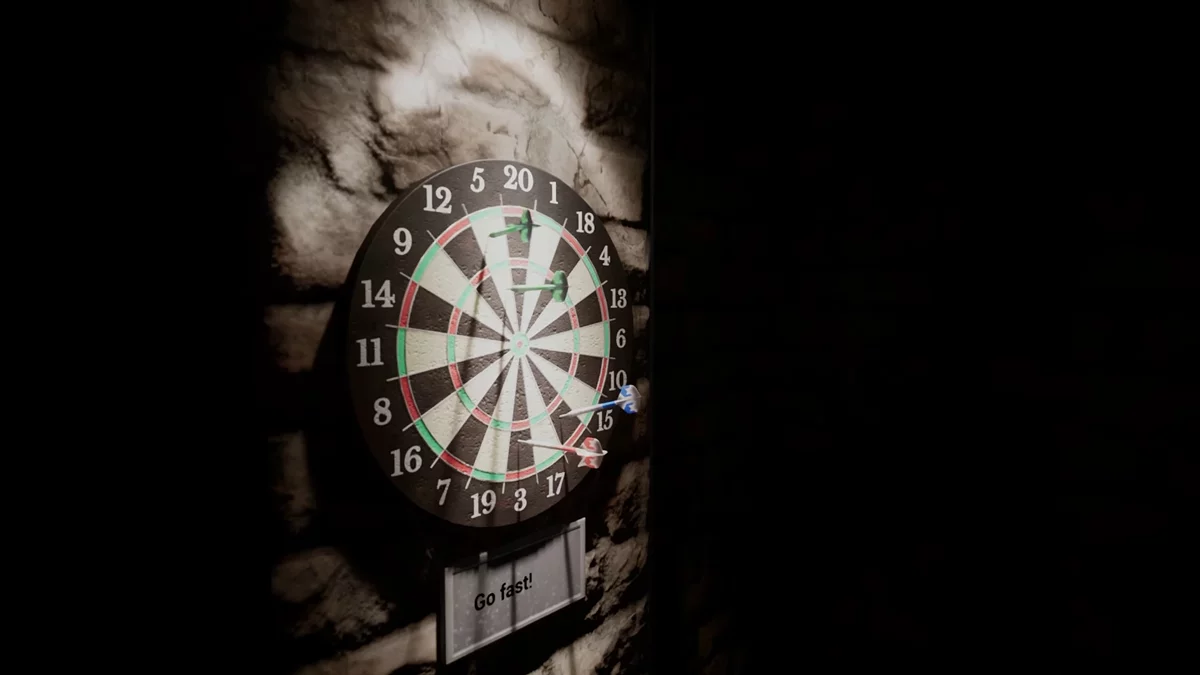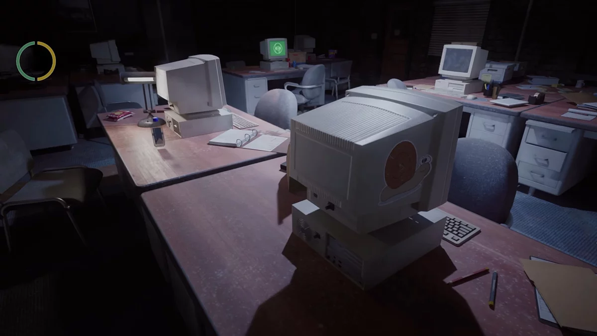 Далі стоїть велика кількість офісних столів з незвичайними зображеннями на моніторах комп'ютерів. Зверніть увагу на дартс в кінці приміщення. Тут 2 зелених дротики на номер п'ять, червоний на номер три і синій на номер два.
