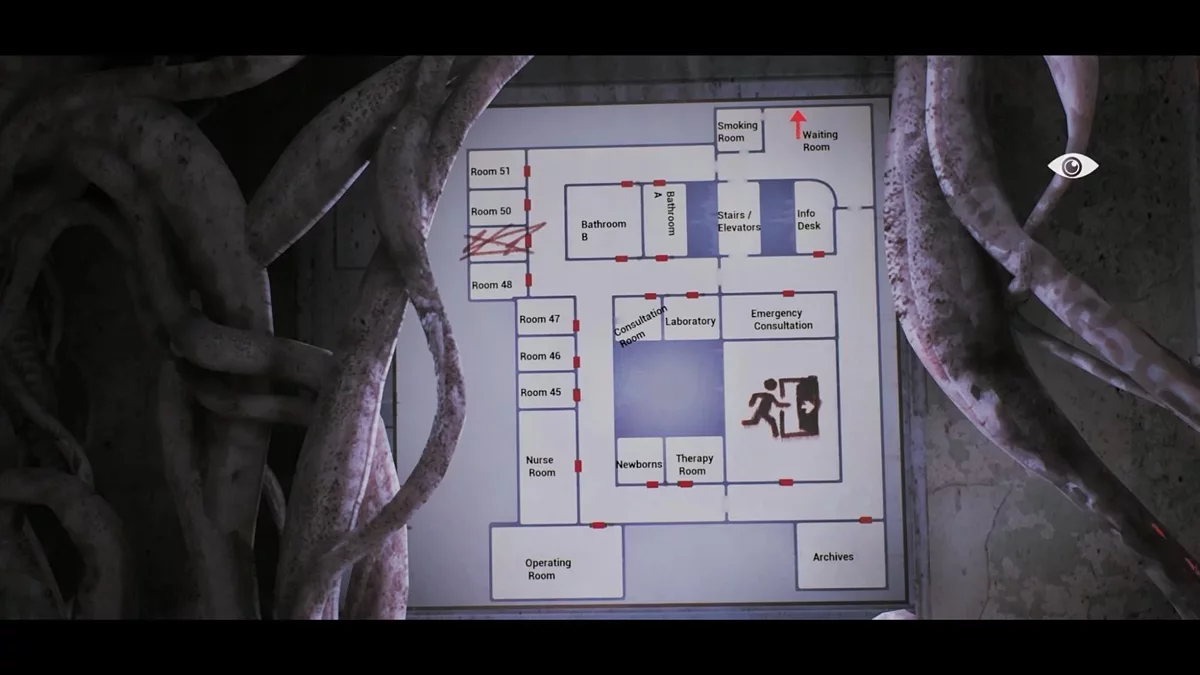 Очнувшись за персонажа, обійдемо кімнату зліва і помітимо карту на стіні. Оскільки ця локація дуже заплутана, вона знадобиться нам в якості зручного орієнтира. Ми знаходимося в кімнаті очікування (Waiting room).