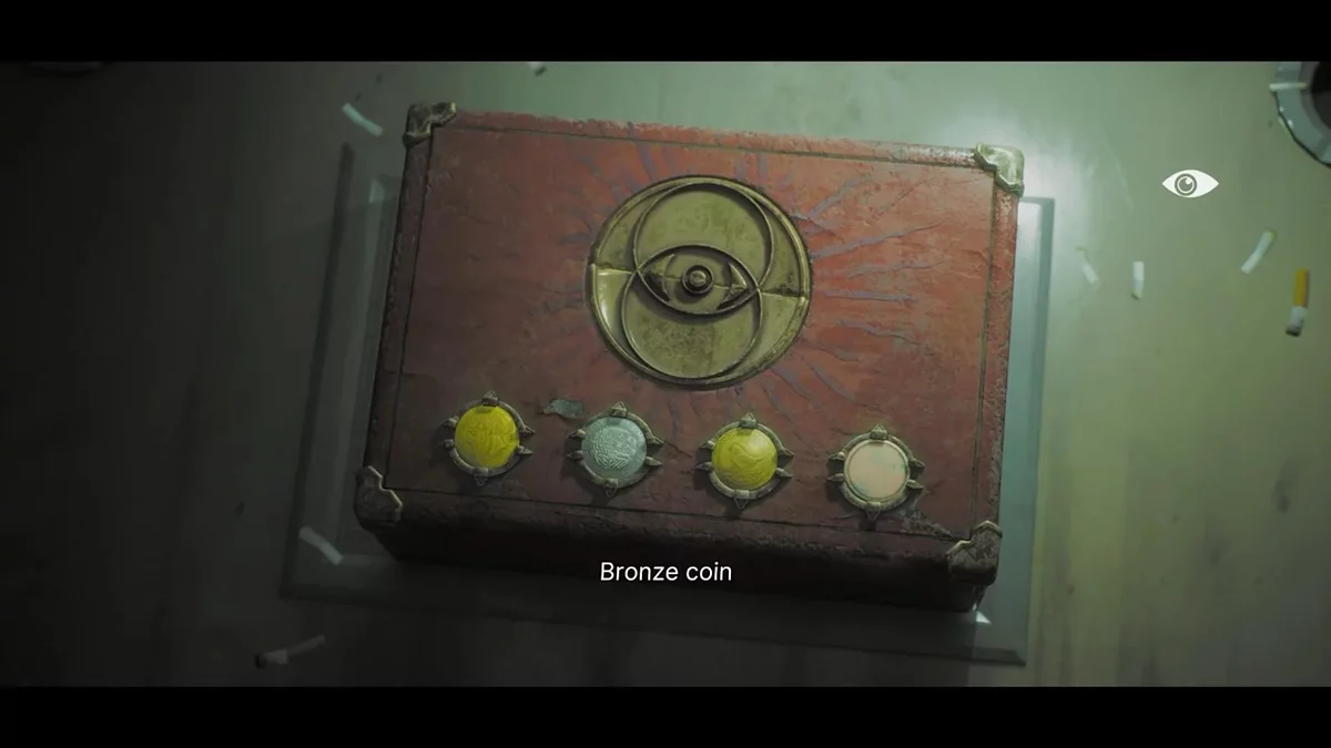Повернемося в курильне приміщення неподалік від стартової точки, де отримали першу монетку. Навпроти автомата лежить коробка, на яку потрібно скласти всі зароблені монети. Гра вимагатиме розташування в правильному порядку. Згадаємо послідовність з комп'ютера Уейда Юто, який розташований у інформаційній стійці (Info Desk):