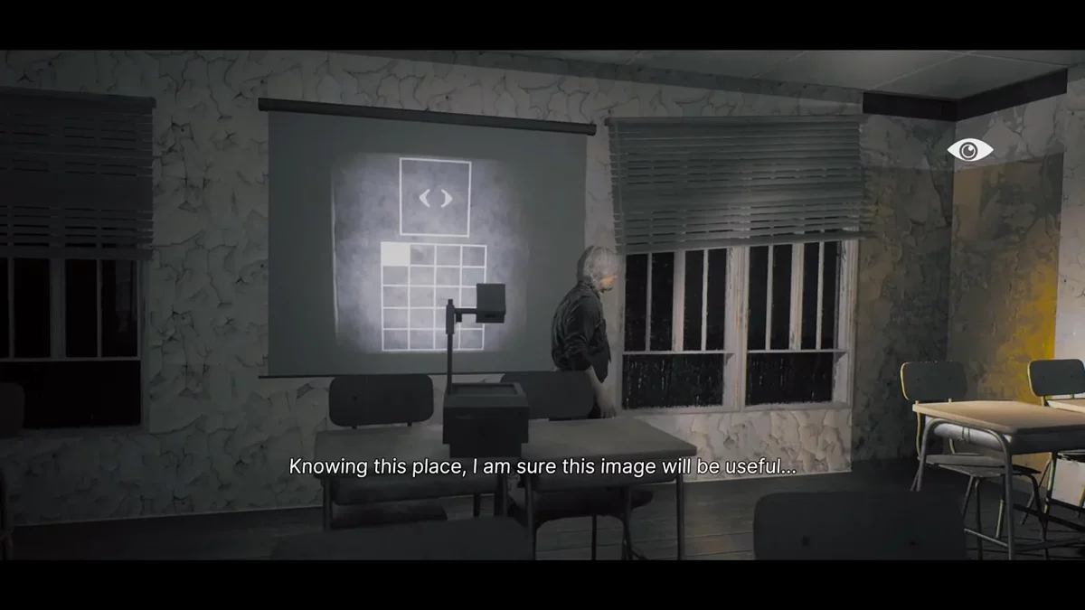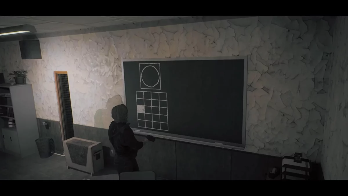 Вийдемо і дійдемо до тупика, де є вхід у підсобне приміщення (Janitor). Всередині є загадка: зачинений шафа з запобіжниками і дошка з цифрами. Зберіть замкнуту фігуру з візерунків, щоб отримати код 413. Розблокувавши шафа, побачимо незвичайне миготіння різних кольорів.