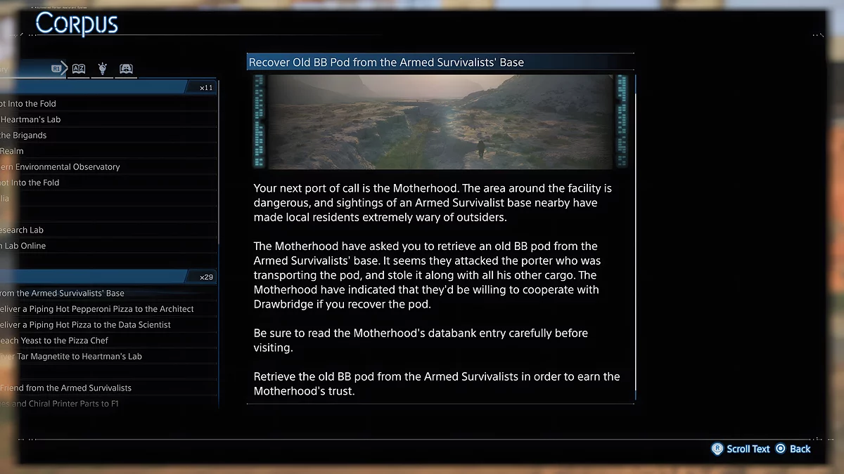 У процесі проходження сюжетного замовлення №026 «Поверніть стару капсулу з ББ з бази озброєних виживальників» (Recover Old BB Pod From Armed Survivalists Base), герой у пункті призначення зустріне двері, на яких потрібно ввести код.