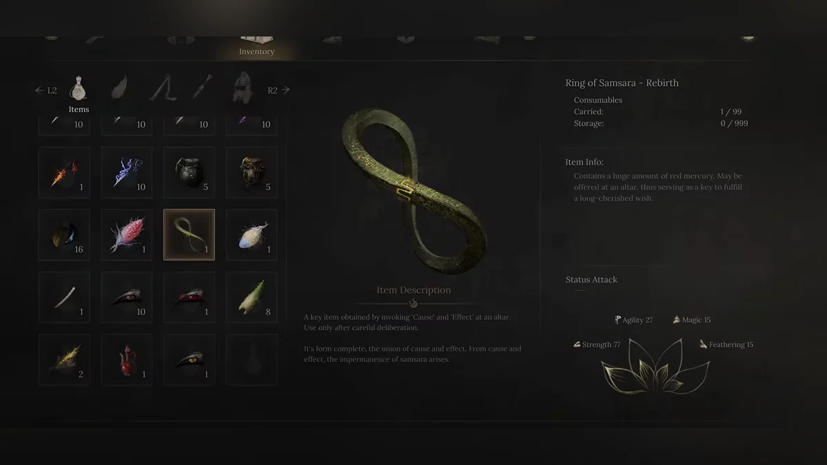 Важливо пройти завдання Фан Яо, Хе Юцяя і Старця в білому. У фіналі четвертого регіону Фан Яо і Хе Юцяй повинні дати вам дві половинки кільця. Вони з’являться в Святому храмі. Якщо цього не сталося — ви зробили щось не так і істинну кінцівку отримати не вдасться. Поспілкуйтеся спочатку з Фан Яо за святинєю на дерев’яному мосту, щоб отримати Дослідницький щоденник — Фрагмент 3 і Кільце Сансари-причина. Потім на верхніх поверхах неподалік знайдіть Хе Юцяя. Двічі поговоріть з ним: «Ти, здається, щось забув», «Не зовсім», показати Дослідницький щоденник — Фрагмент 3, «Що з тобою?». В нагороду заберіть Кільце Сансари-наслідок. Ніяк не взаємодійте з кільцями в інвентарі.