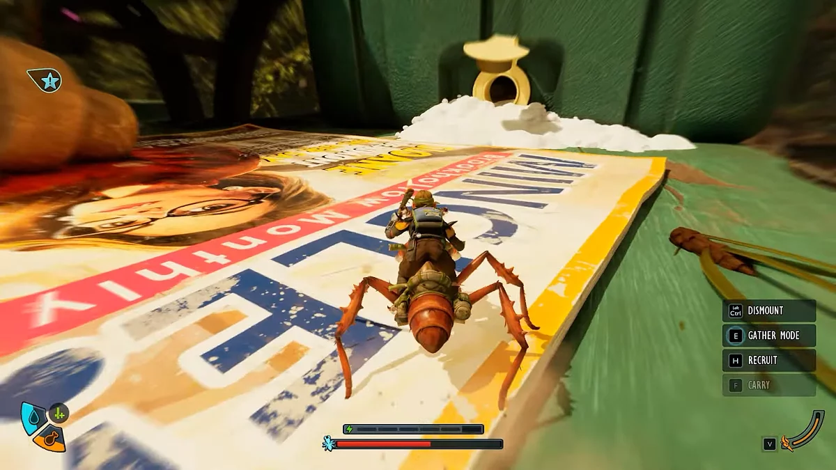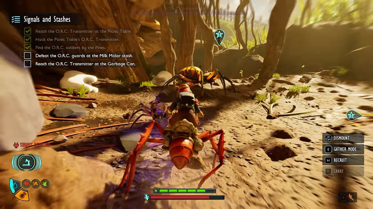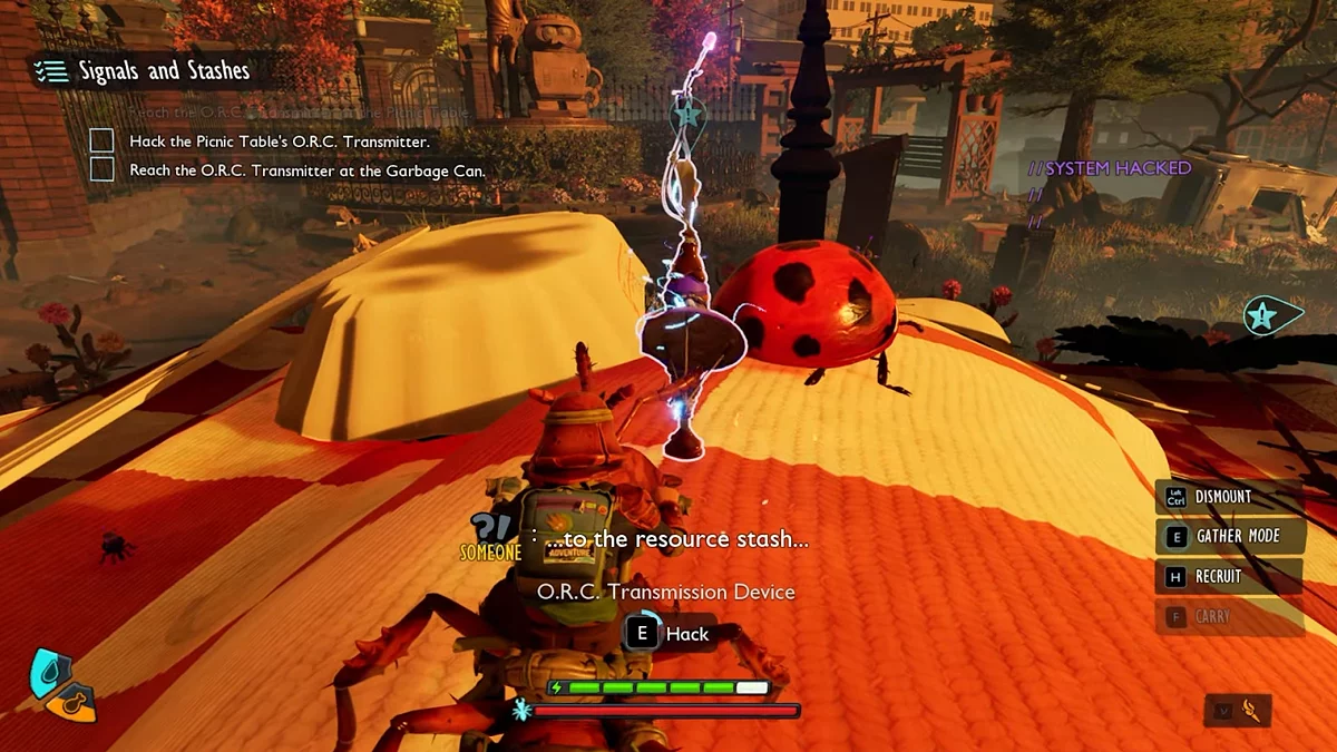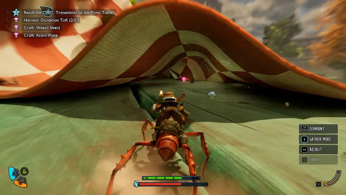 Обережно пройдіть паркур, поки не доберетеся до самого верху. Зламавши антену, спустіться вниз, не втрачаючи очок. Прослідуйте до нової мітки, де вам знову потрібно буде перемогти досить сильну бджолу. Там же ви можете зібрати шматочки чорниці для покращення вашого мульти-інструмента до другого рівня. Звісно, вам ще знадобиться оболонка таргана, але його досить легко знайти в зоні пікніка або смітника.