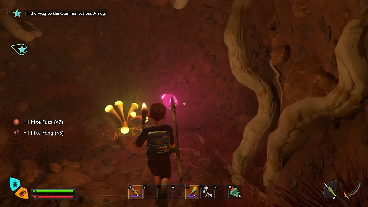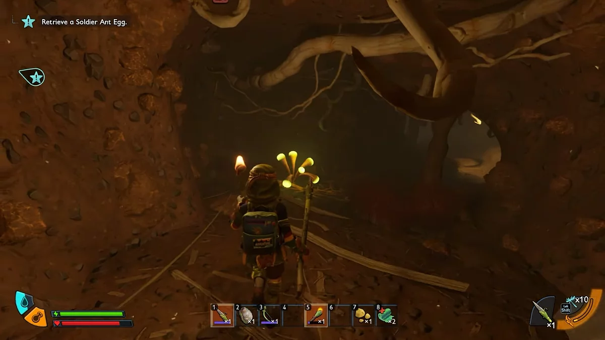 Так ви опинитеся в печері. Чтобы освітлювати шлях, потрібно буде виготовити світильник. Робиться він з невеликого паростка, краплі смоли та сухої трави. Усі ці ресурси можна зібрати неподалік від входу в тунель. Візьміть світильник у другу руку і вирушайте в темні глибини.