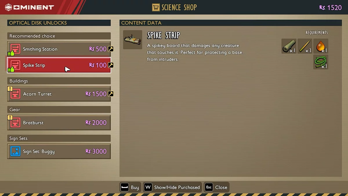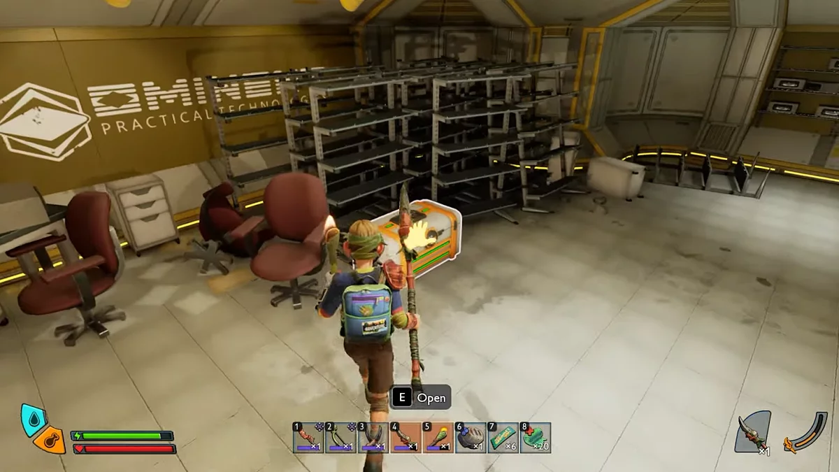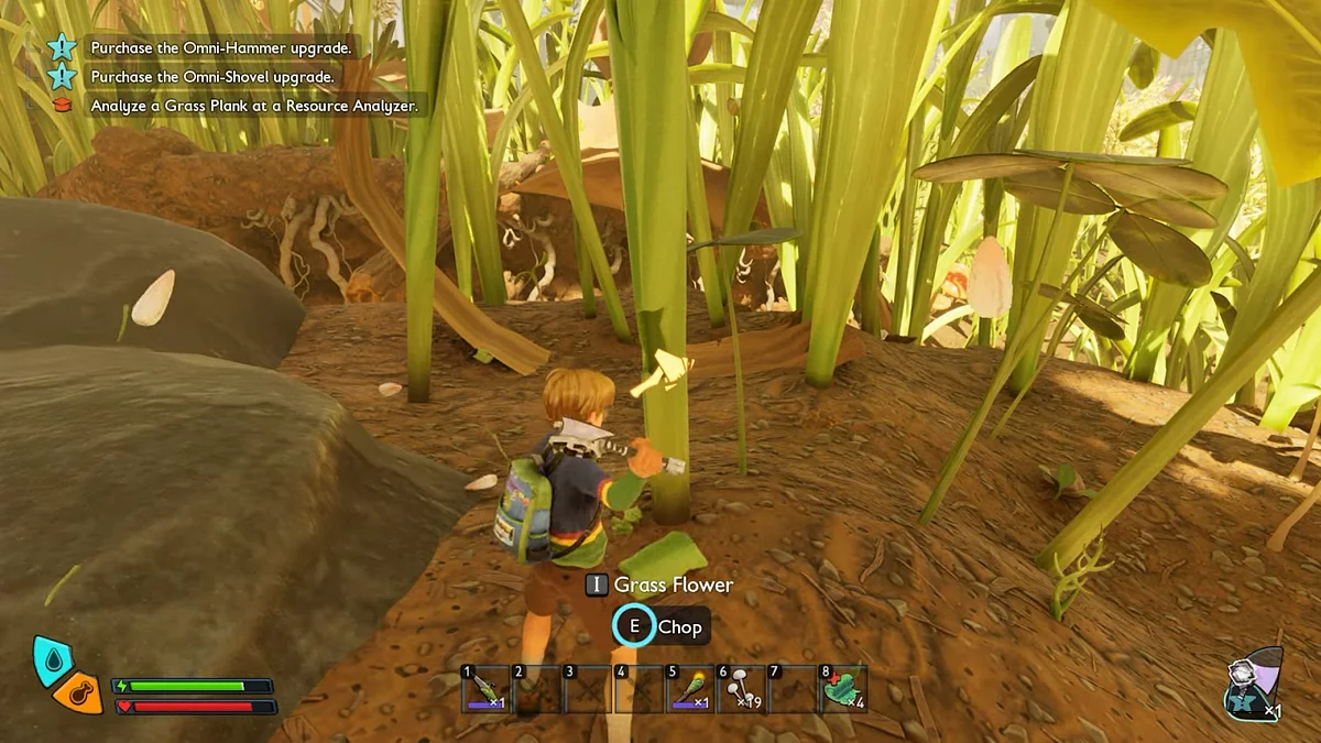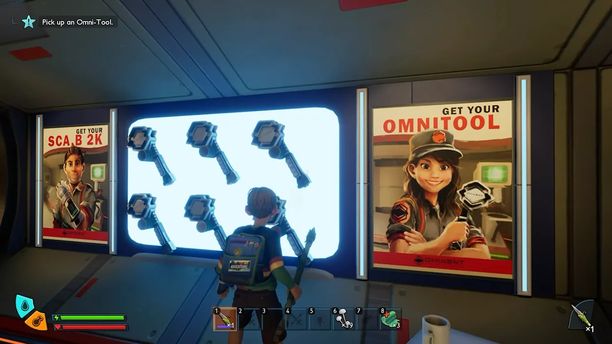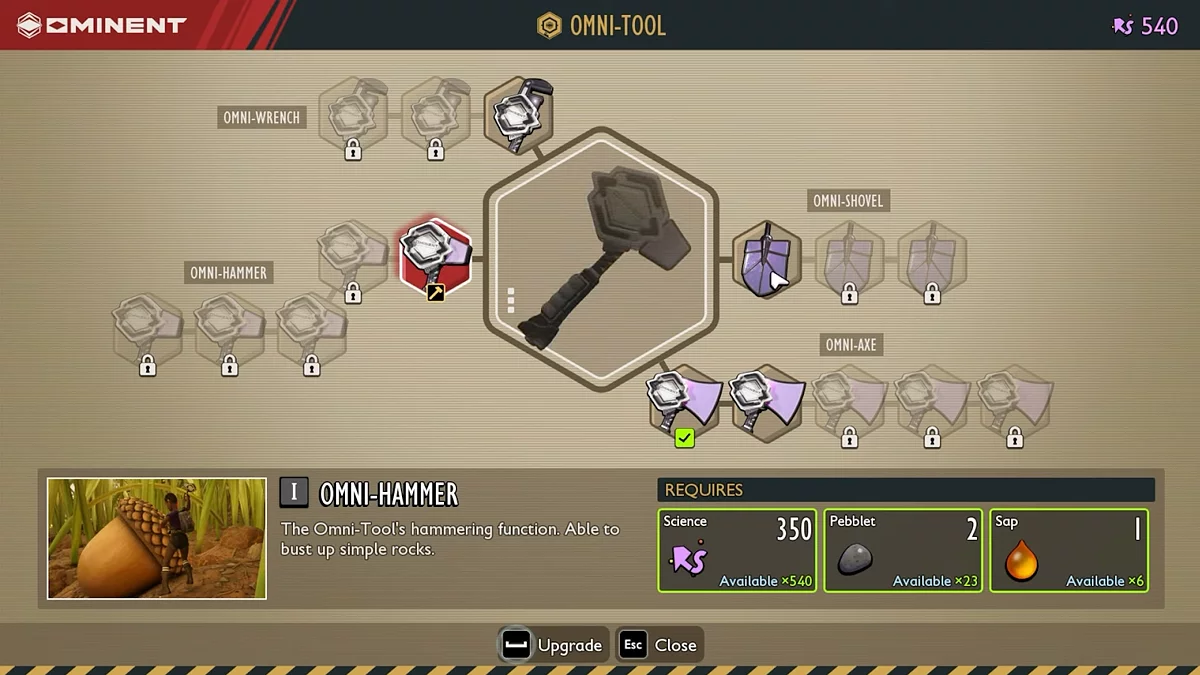 Наступне ваше завдання — придбати покращення молота і лопати для омні-інструмента. Для цього знадобляться різні ресурси. Щоб купити молот, зберіть визначену кількість очок науки, каміння та крапель смоли.