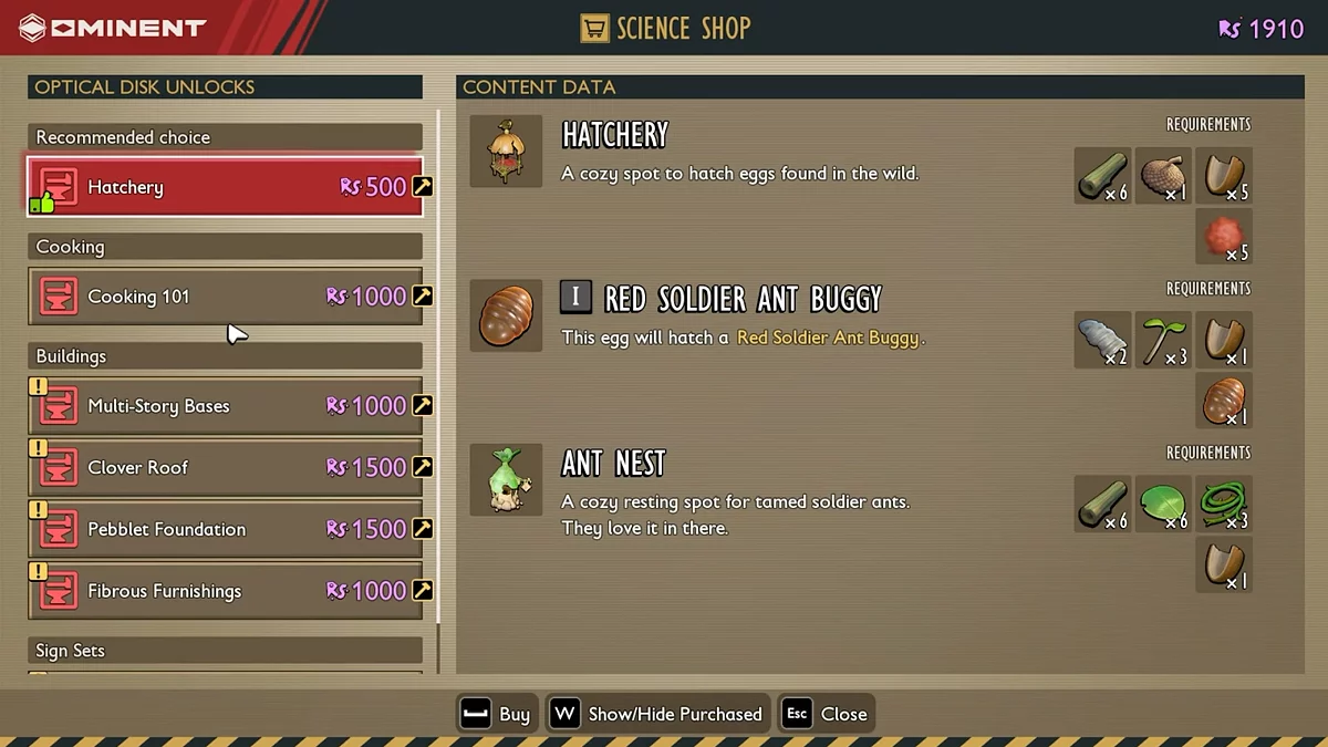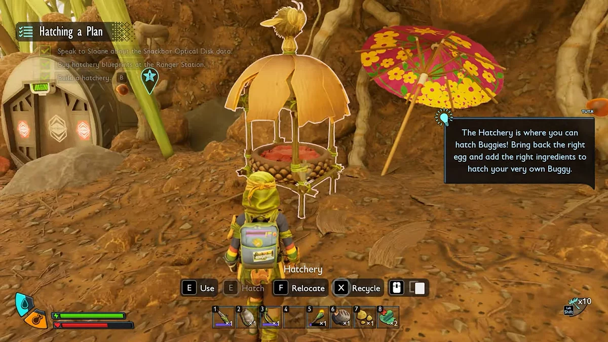 Після недовгої розмови з пані Слоун придбайте чертежі інкубатора у пристрою за вами. Для цього вам знадобиться 500 одиниць науки. Потім зведіть перший інкубатор, зібравши п’ять шматочків стебла бур’яну, плюс горішок, його п’ять частин оболонки та матеріал, що випадає після вбивства кліщів. Останній ресурс ви, ймовірно, вже накопичили, а всі інші можна знайти неподалік від польової лабораторії.