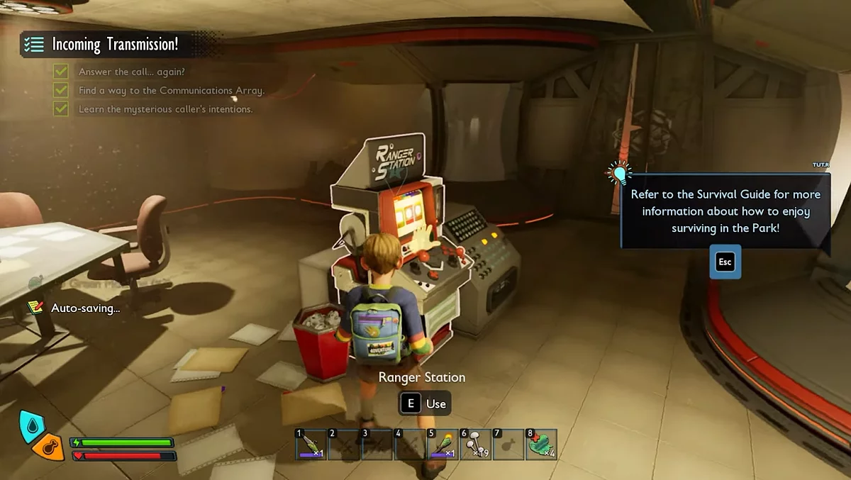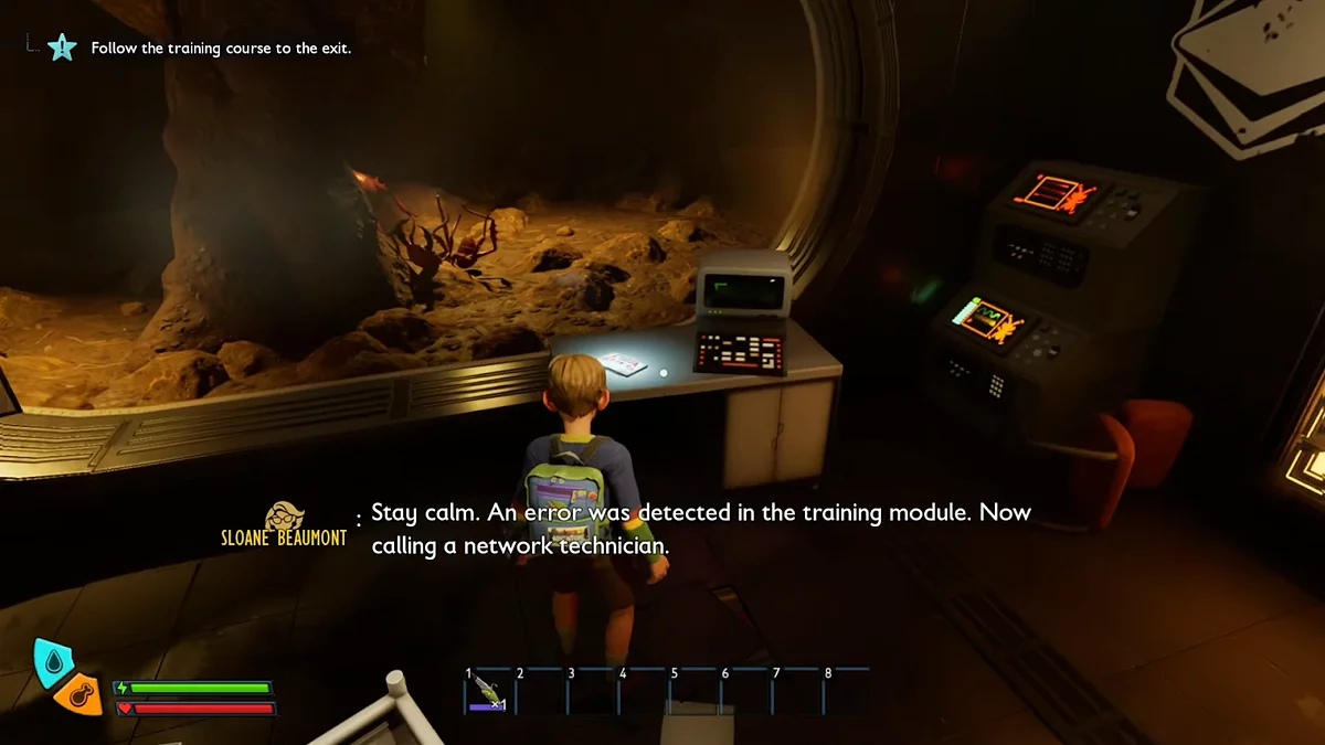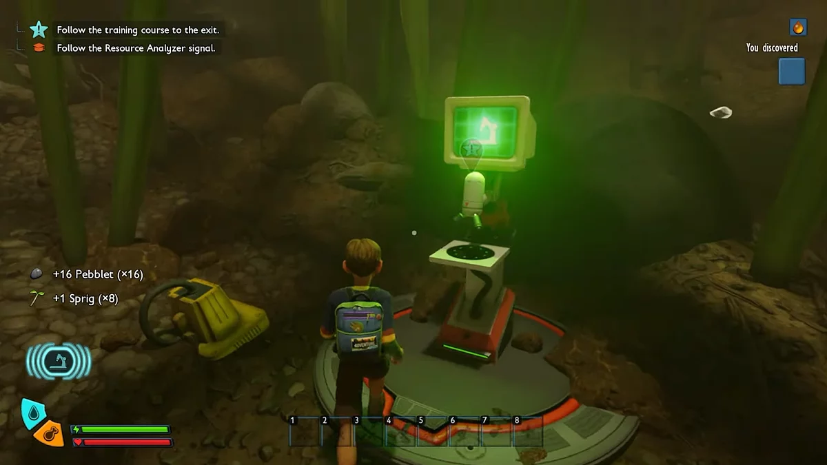 Після дзвінка поверніться в приміщення, де вчилися правилам ведення бою, і через центральні двері вийдете в світ дикої природи. Там направляйтеся до синьої мітки, по дорозі не забуваючи збирати ресурси та досліджувати світ.