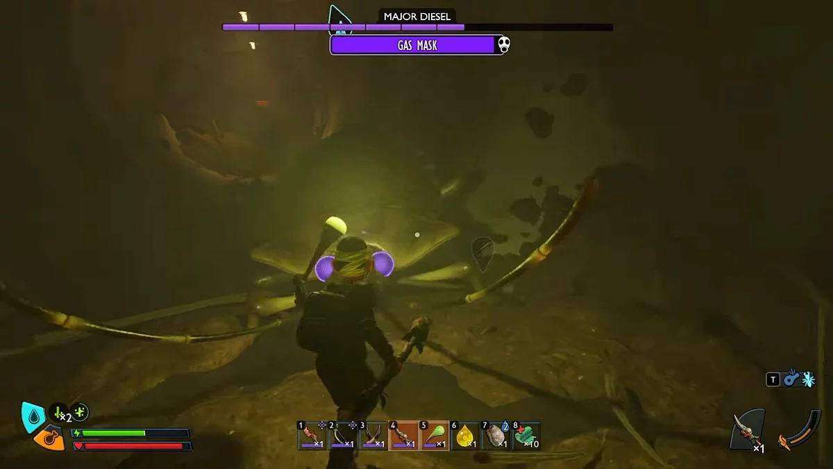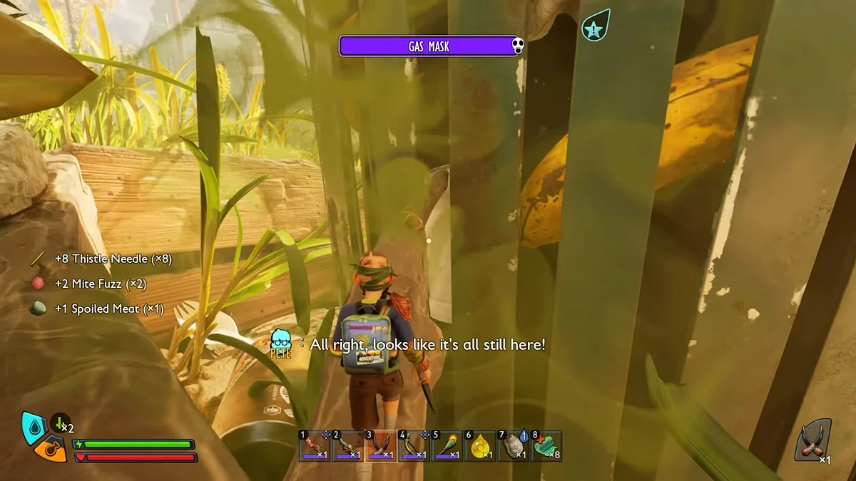 Потім завітайте до смітника. Перед цим виготовте протигаз, щоб не задихнутися від поганого запаху. Вам знадобиться носик довгоносика, шерстка мошки, частинка клопа та мотузки. Щоб знайти довгоносика, прогуляйтеся навколо лабораторії і уважно огляньте ділянки, де росте багато трави. Однак, найімовірніше, ви вже зібрали цей матеріал під час обстеження попереднього передавача або під час ворожого нападу. У разі необхідності використовуйте інструмент для пошуку ресурсів.