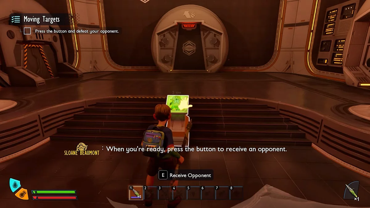 Вирушайте в наступне приміщення тренувального комплексу. За допомогою кнопки в центрі кімнати викличте собі супротивника. У такому розминковому бою вас навчать основним бойовим механікам.