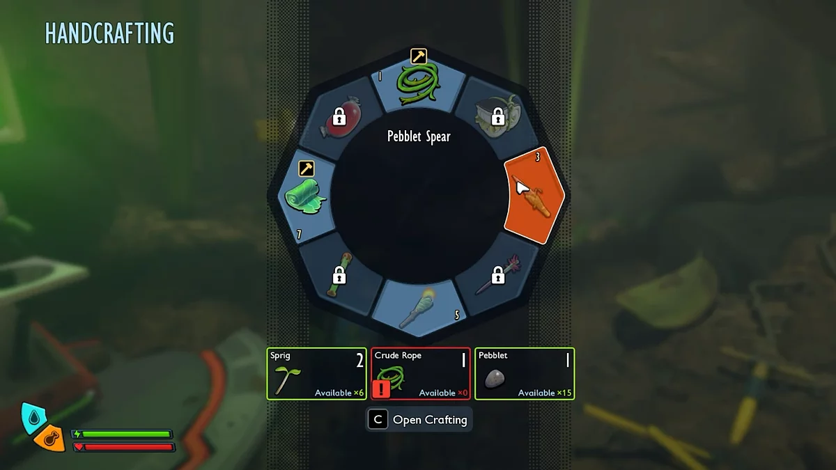 На відкритій арені зберіть каміння, рослинні волокна та інші ресурси, які знайдете тут. Підійдіть до пристрою посередині. З його допомогою досліджуйте каміння та рослинні волокна. Тепер у вас відкриються деякі нові рецепти крафту, в тому числі і кам'яне спис. Виготовте його, спочатку створивши прості мотузки.