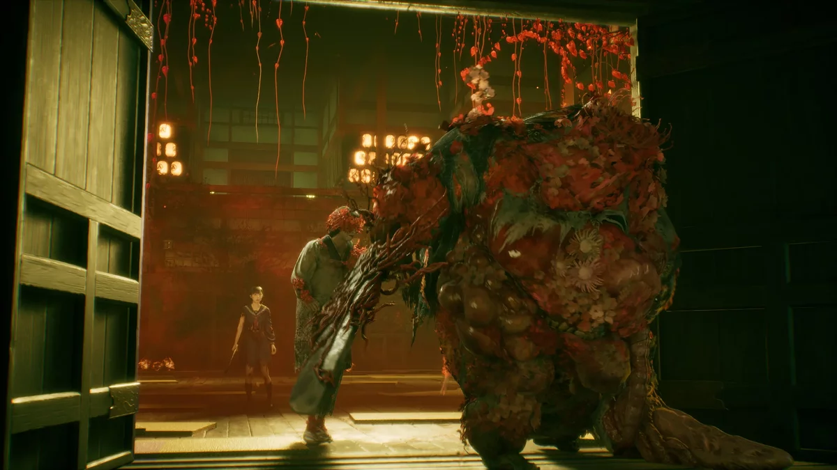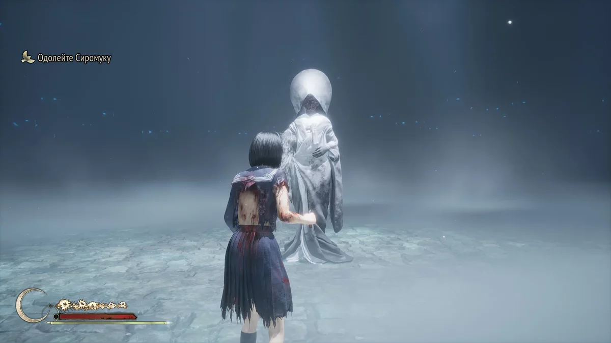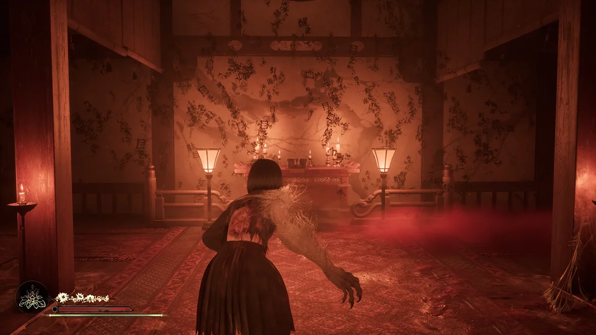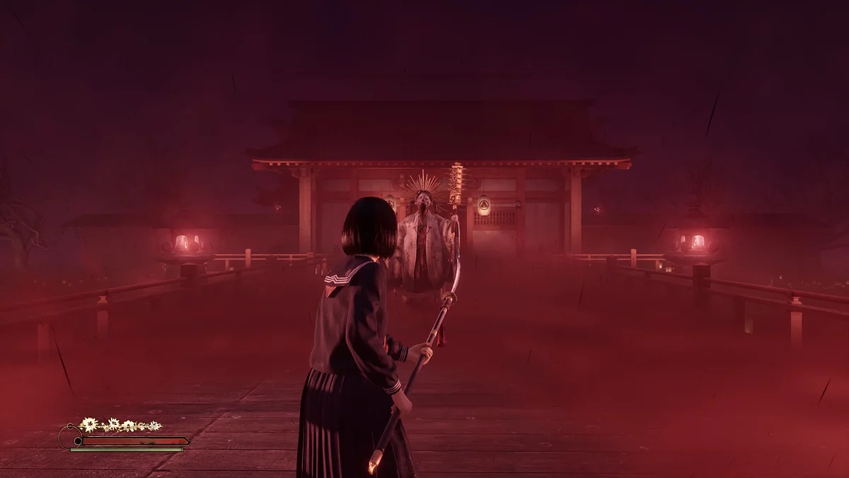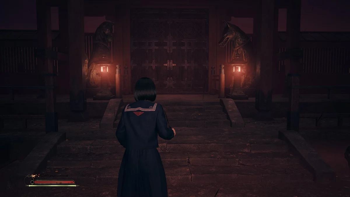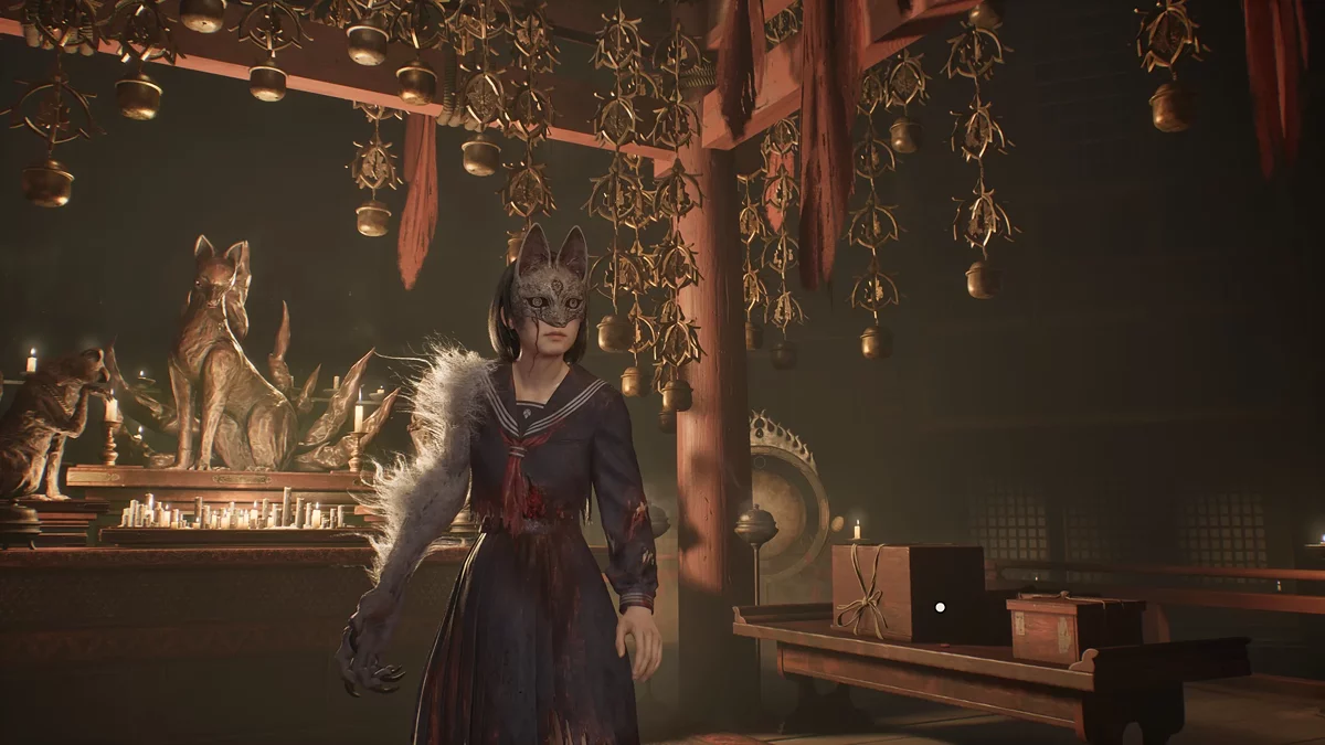 Після зустрічі з туманним чудовиськом Хінако опинилася в темному святині. Вирушайте коридором вперед і подивіться катсцену останнього ритуалу з чоловіком у масці лиси.