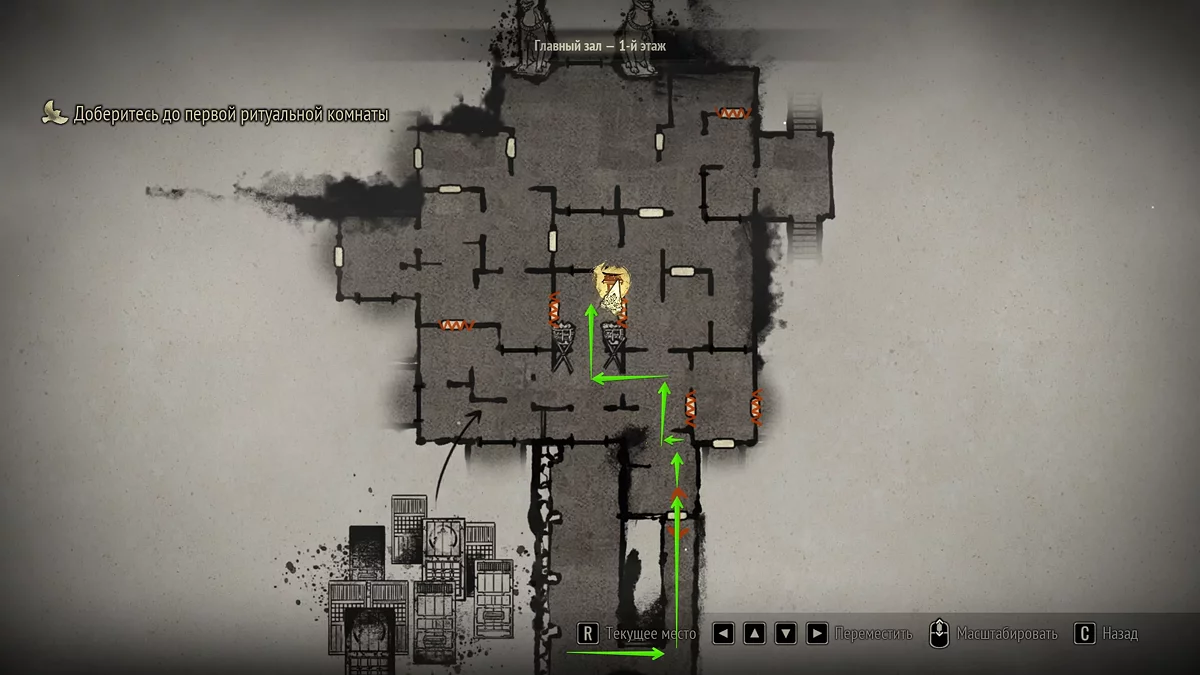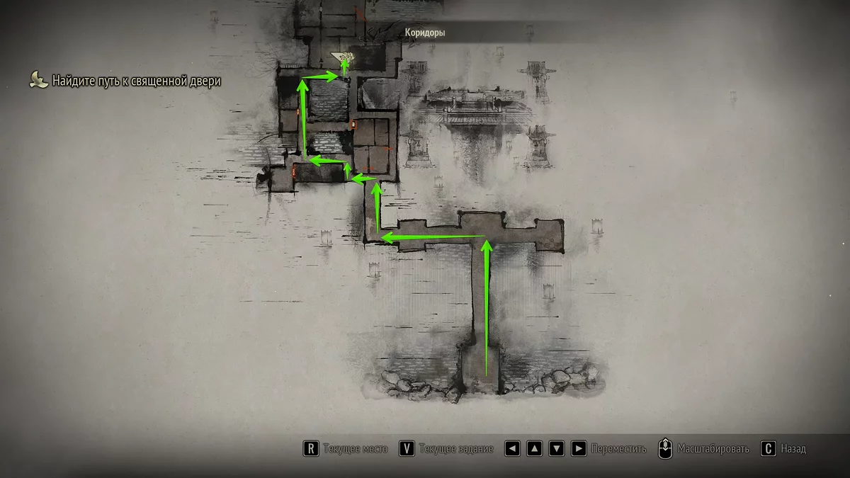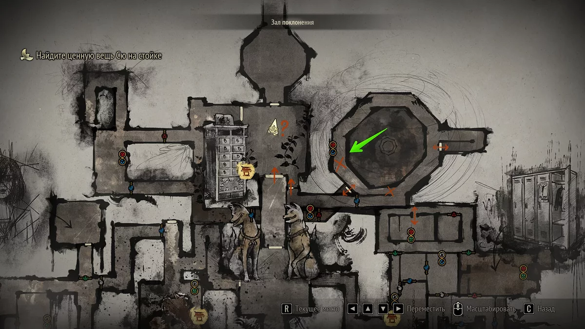 Чоловік у масці приведе до скарбниці, зліва від якої є вівтар. Збережіться і підійдіть до дверей. Щоб їх відкрити, необхідно вирішити головоломку, тому в наступному розділі ми дамо відгадку для кожного рівня складності.
